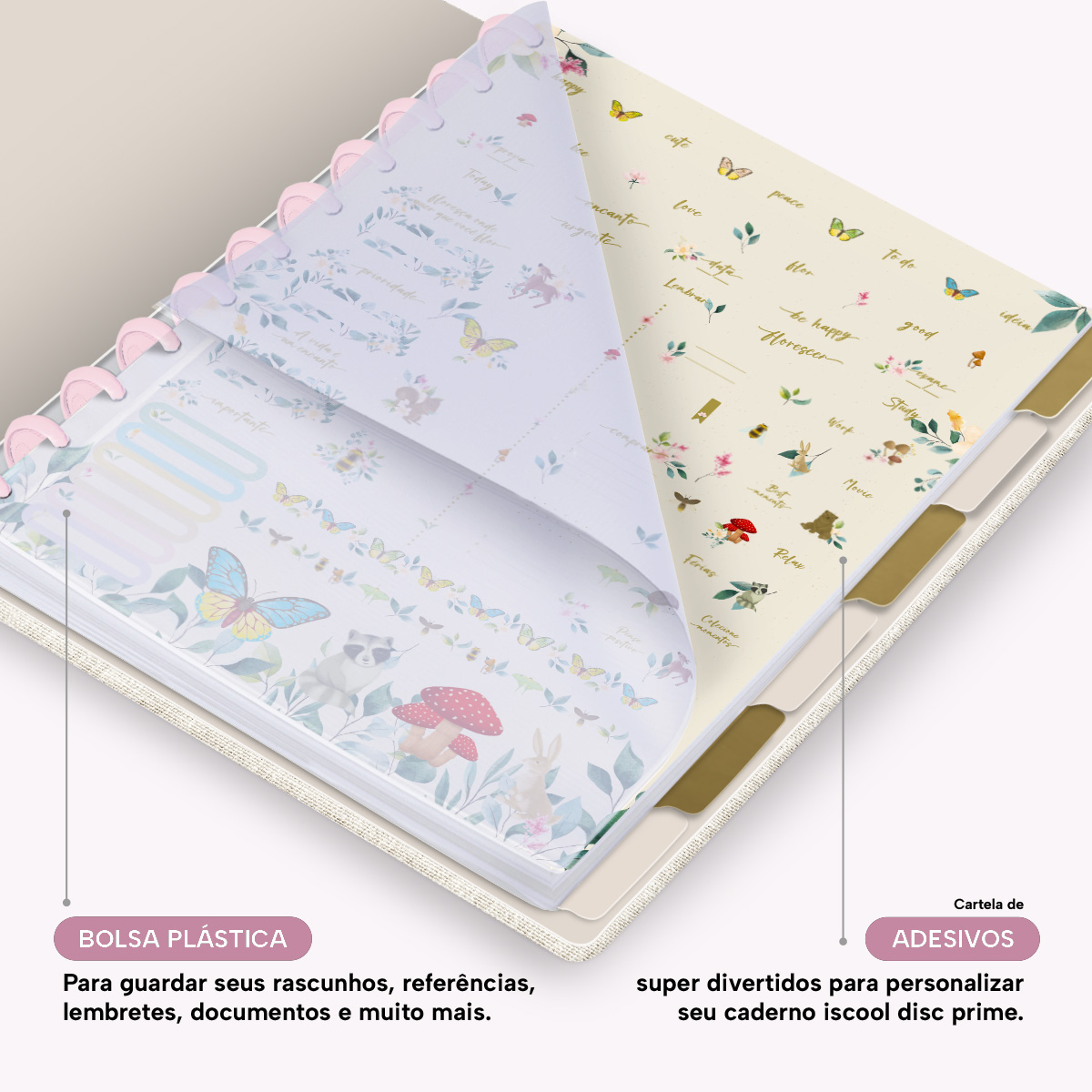 Além de tudo isso, o Iscool Disc Prime, conta com detalhezinhos que fazem toda diferença: elástico para fechamento da capa, muito mais estilo e privacidade para suas anotações; bolsa plástica para guardar seus rascunhos, referências, lembretes, documentos e uma cartela de adesivos incríveis, para que você possa personalizar seu caderno do seu jeitinho!