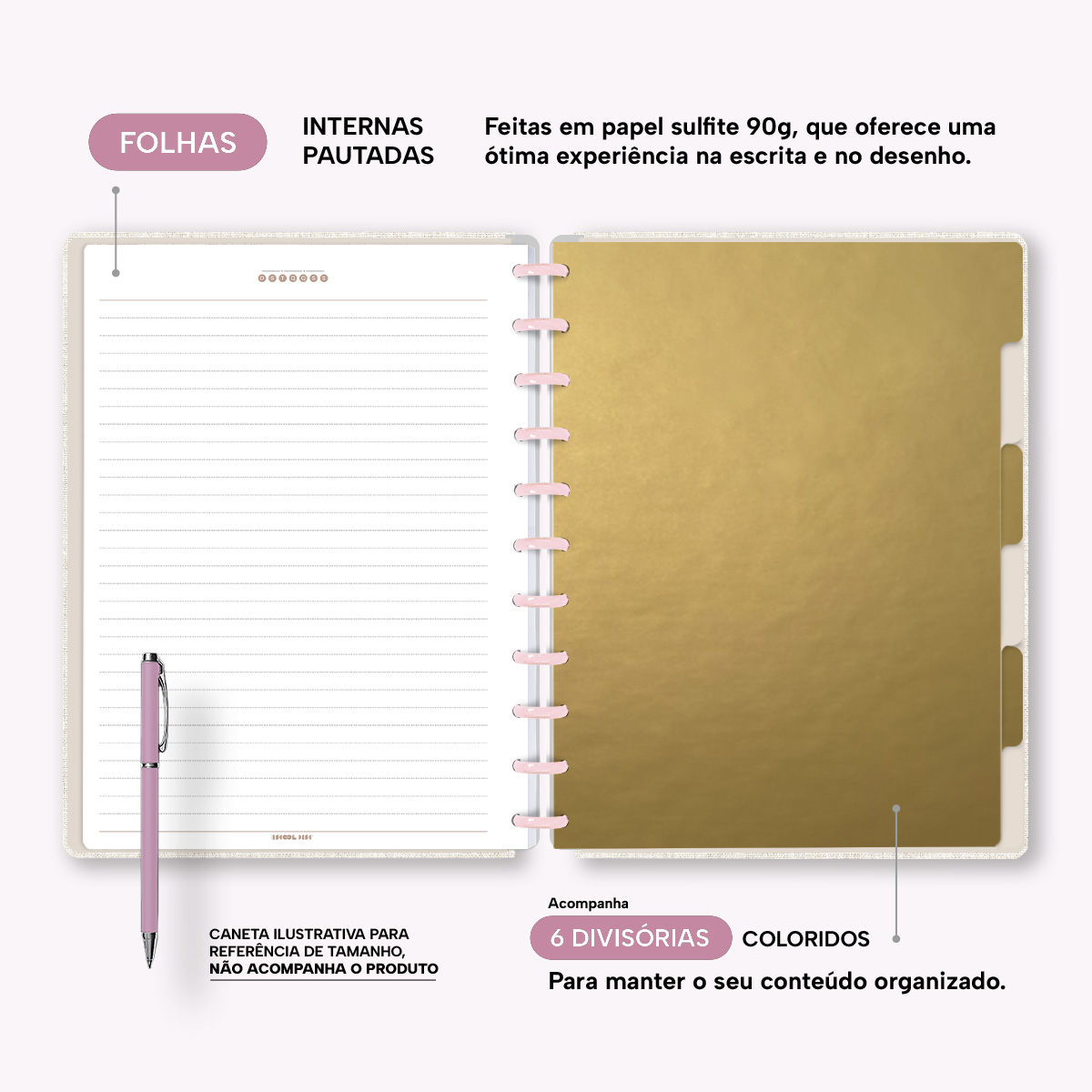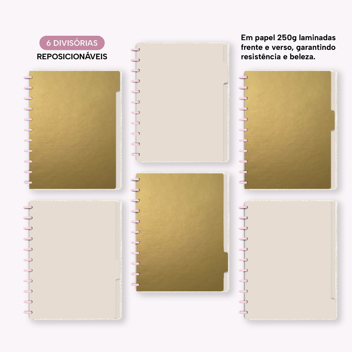 A capa é dura com impressão digital de alta definição, acompanha 6 lindas divisórias que você pode colocar em qualquer local do caderno, funcionando como o guia perfeito para sua organização.