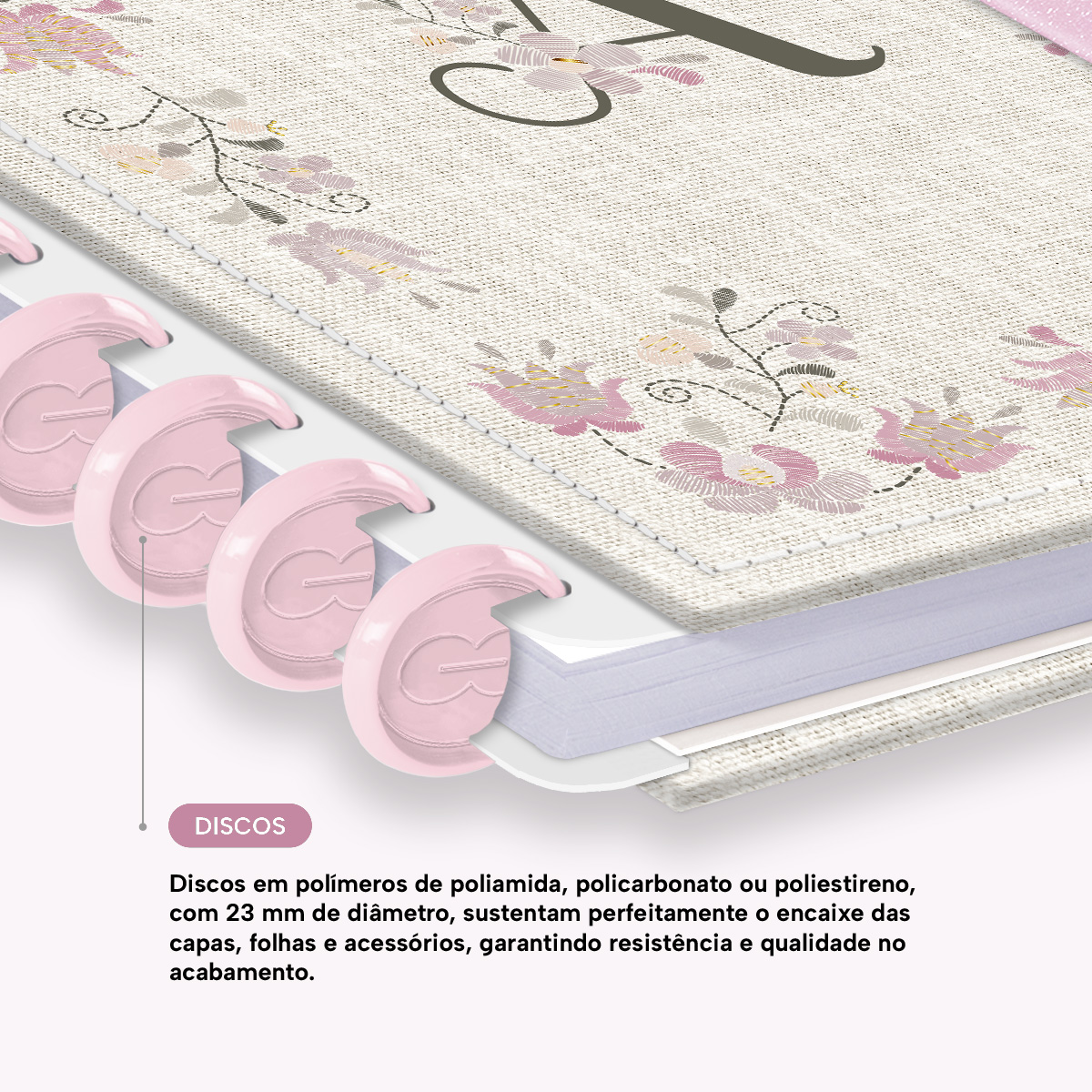 Encadernado com 11 discos M de 23mm em polímero de nylon e/ou policarbonato coloridos, fabricados no Brasil.