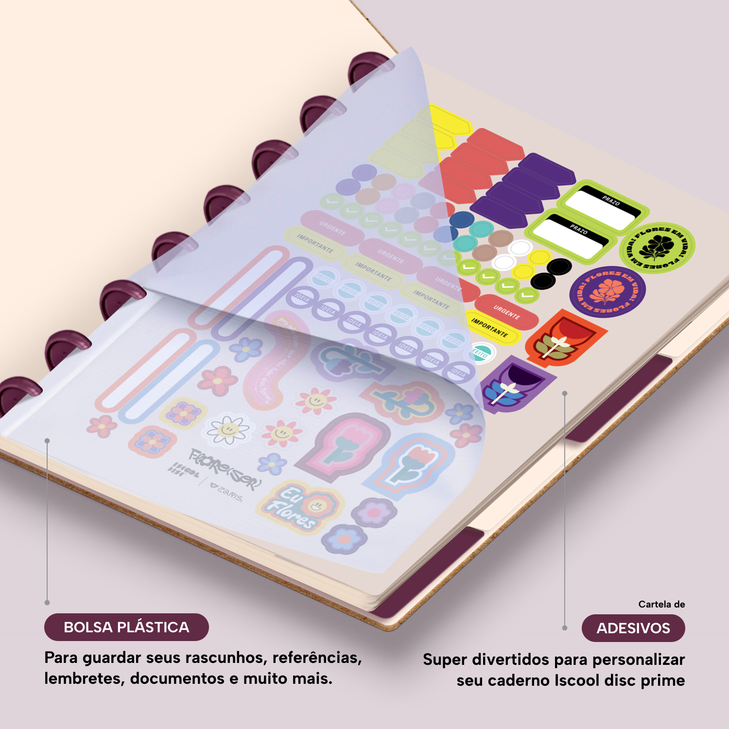 Além de tudo isso, o iscooldisc Prime conta com detalhes que fazem toda a diferença: elástico para fechamento da capa, muito mais estilo e privacidade para suas anotações; bolsa plástica para guardar seus rascunhos, referências, lembretes, documentos e uma cartela de adesivos incríveis, para que você possa personalizar seu caderno do seu jeitinho!