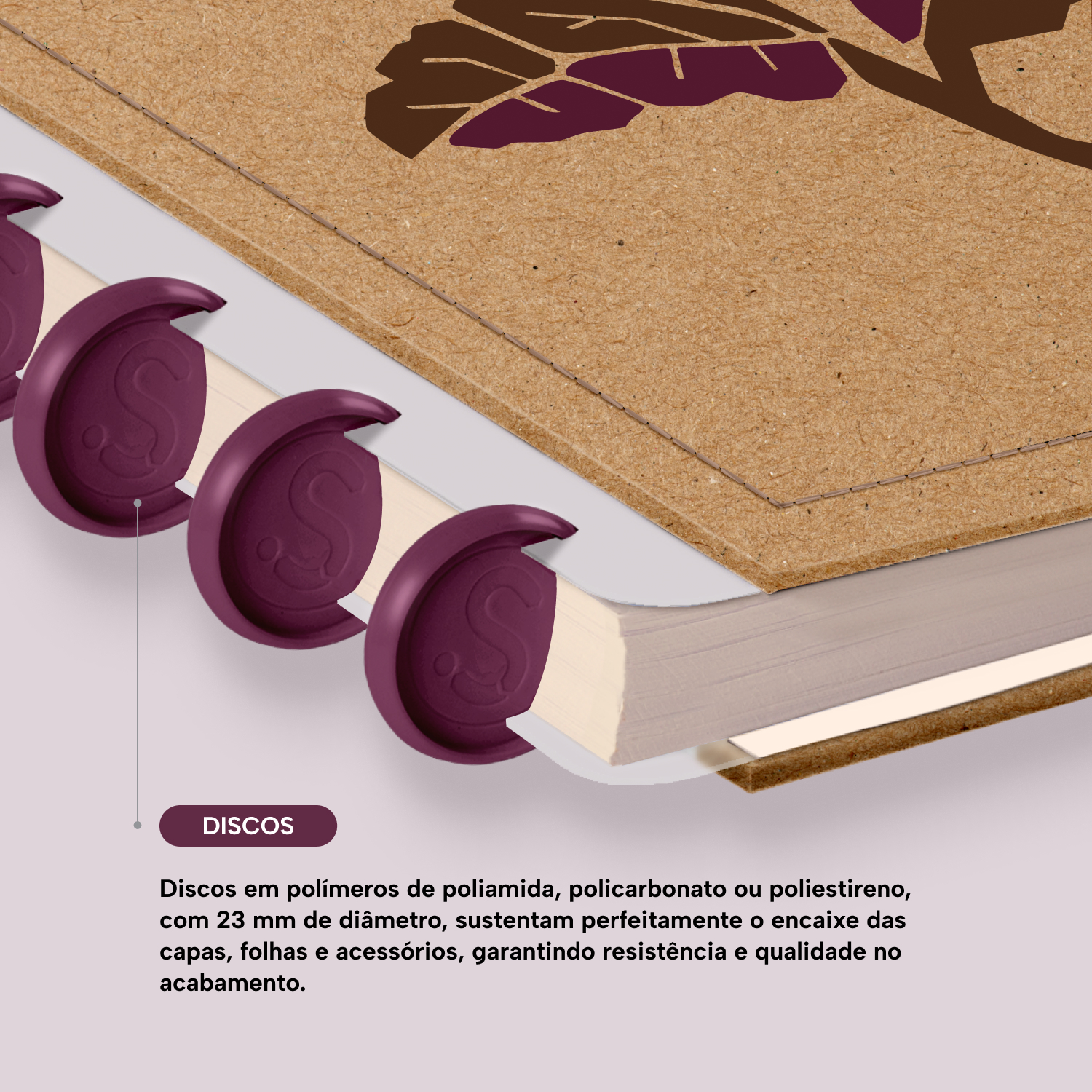 Encadernado com 11 discos M de 23mm em polímero de nylon e/ou policarbonato coloridos, fabricados no Brasil.