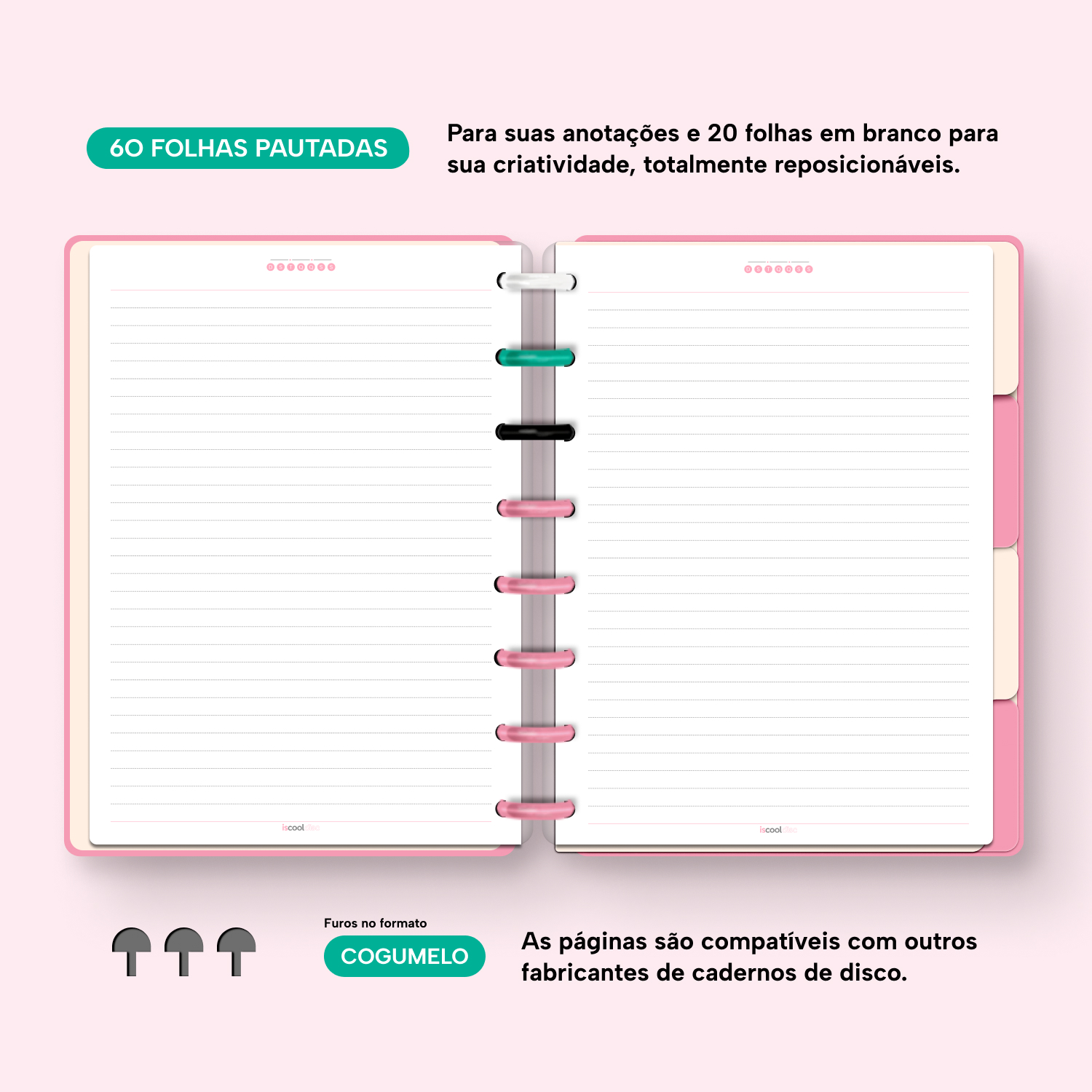 Com furos no formato de “cogumelo”, você poderá dar um “up” em seu caderno com nossos refis, além de ser compatível com outros fabricantes de cadernos de discos.