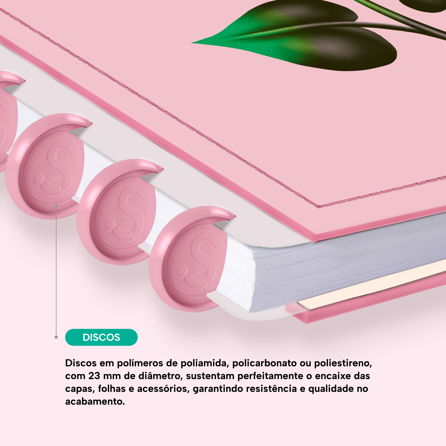 Os nossos discos são fabricados em polímero de nylon e/ou policarbonato. Podem ser substituídos, proporcionando imensa variedade na combinação das cores, qualidade no acabamento e eficácia no encaixe das capas, folhas e acessórios.