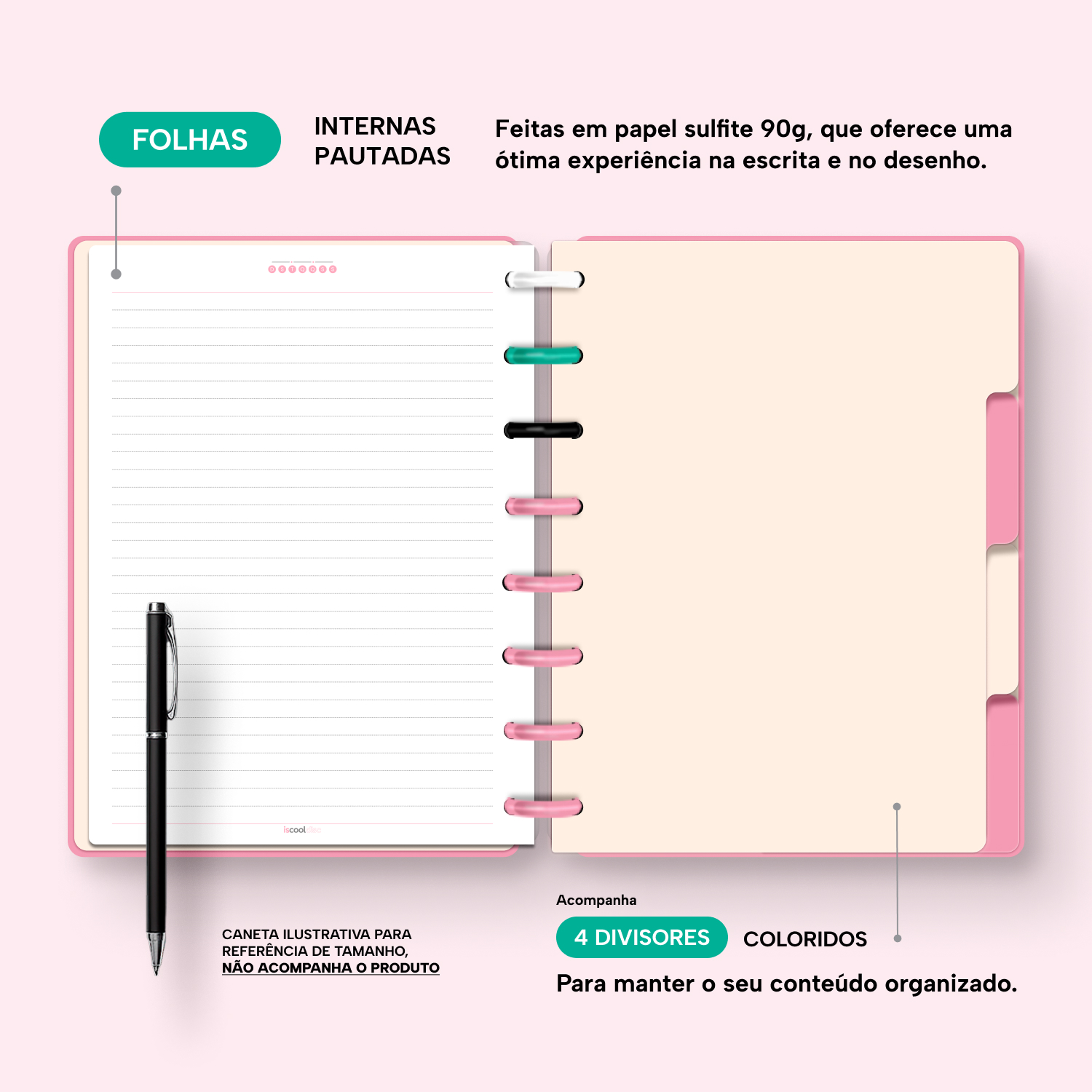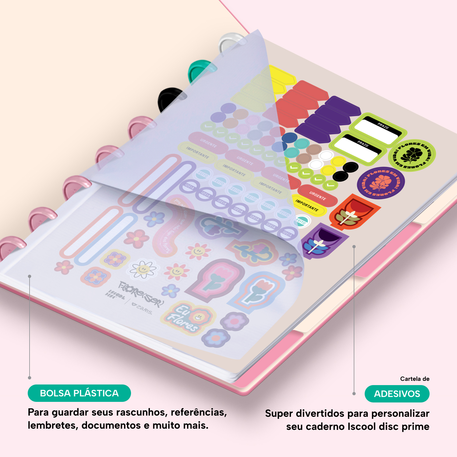 Além de tudo isso, o iscooldisc Prime conta com detalhes que fazem toda a diferença: elástico para fechamento da capa, muito mais estilo e privacidade para suas anotações; bolsa plástica para guardar seus rascunhos, referências, lembretes, documentos e uma cartela de adesivos incríveis, para que você possa personalizar seu caderno do seu jeitinho!
