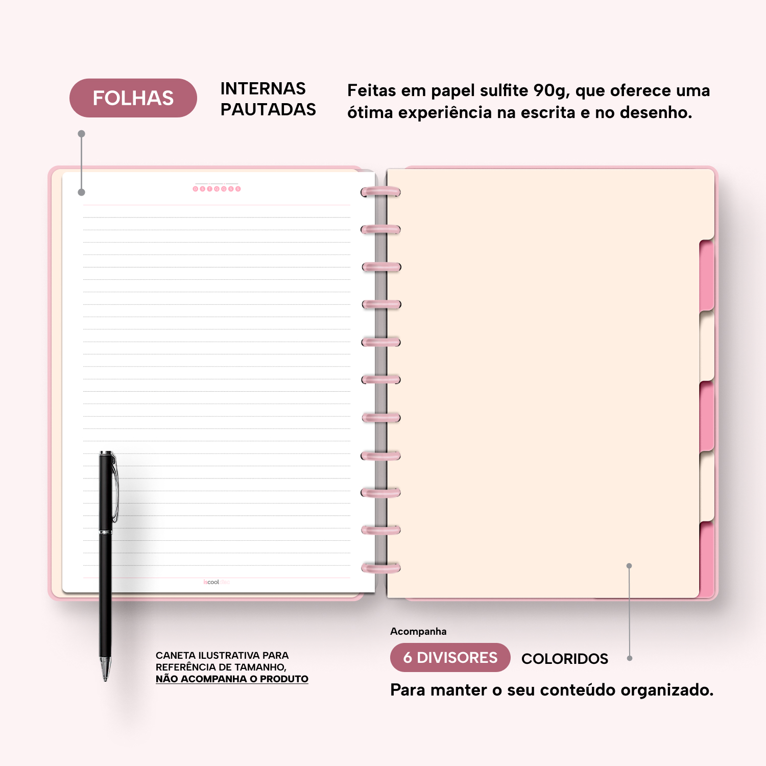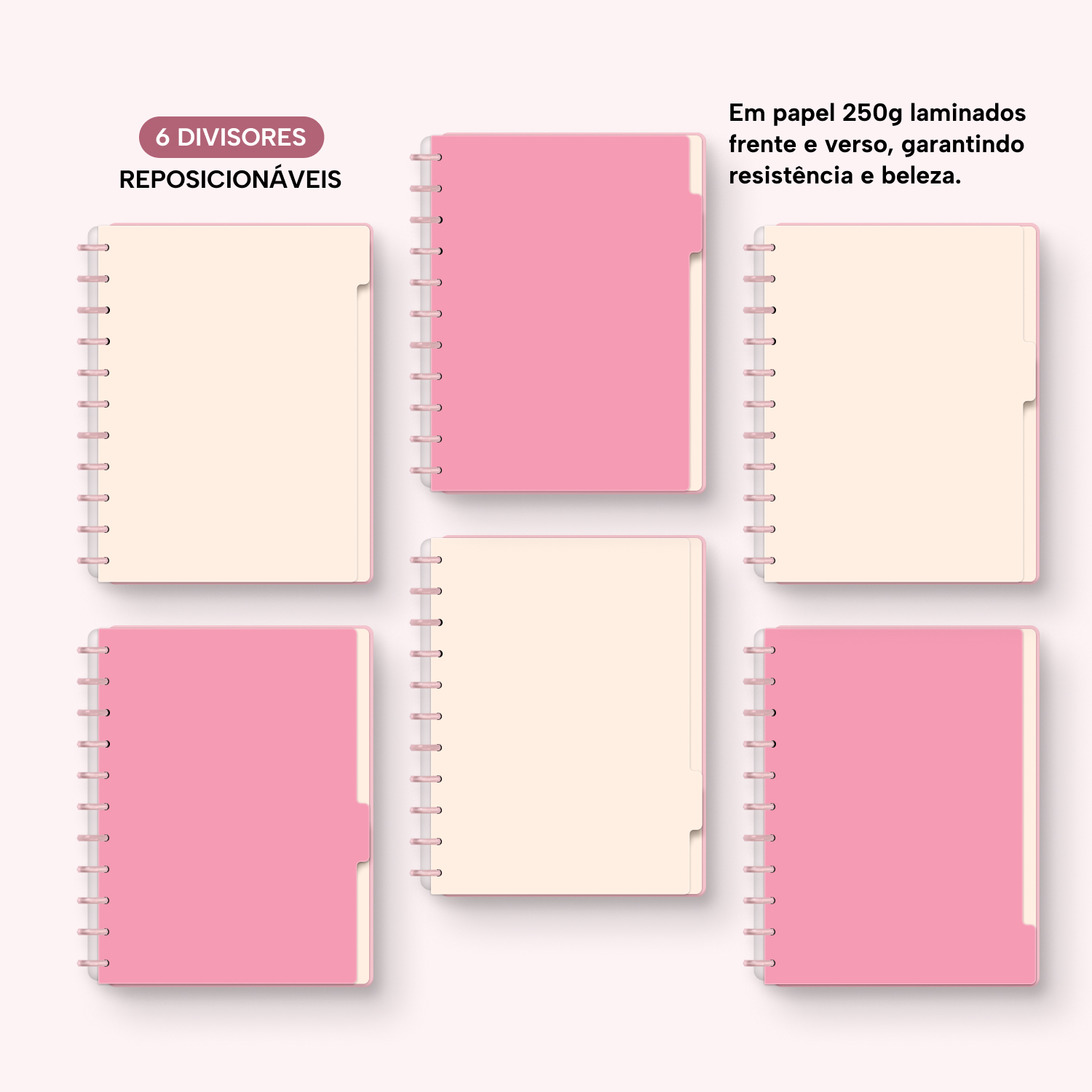 A capa é dura, com impressão digital de alta definição, e acompanha 6 lindas divisórias que você pode colocar em qualquer local do caderno, funcionando como o guia perfeito para sua organização.