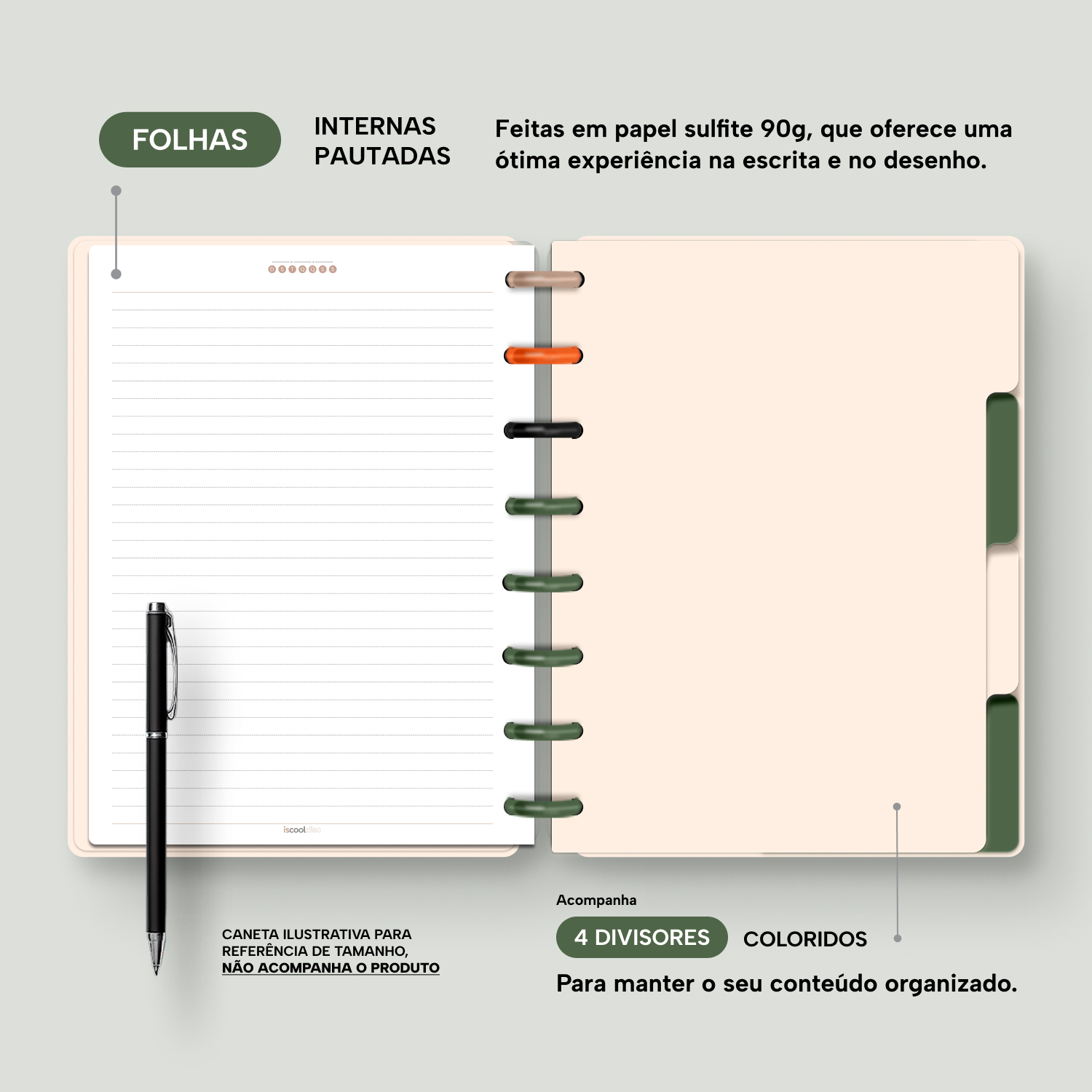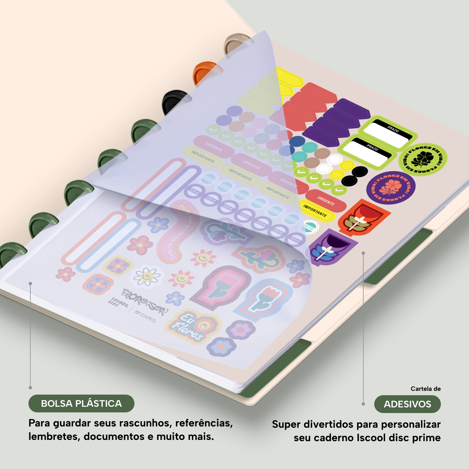 Além de tudo isso, o iscooldisc Prime conta com detalhes que fazem toda a diferença: elástico para fechamento da capa, muito mais estilo e privacidade para suas anotações; bolsa plástica para guardar seus rascunhos, referências, lembretes, documentos e uma cartela de adesivos incríveis, para que você possa personalizar seu caderno do seu jeitinho!