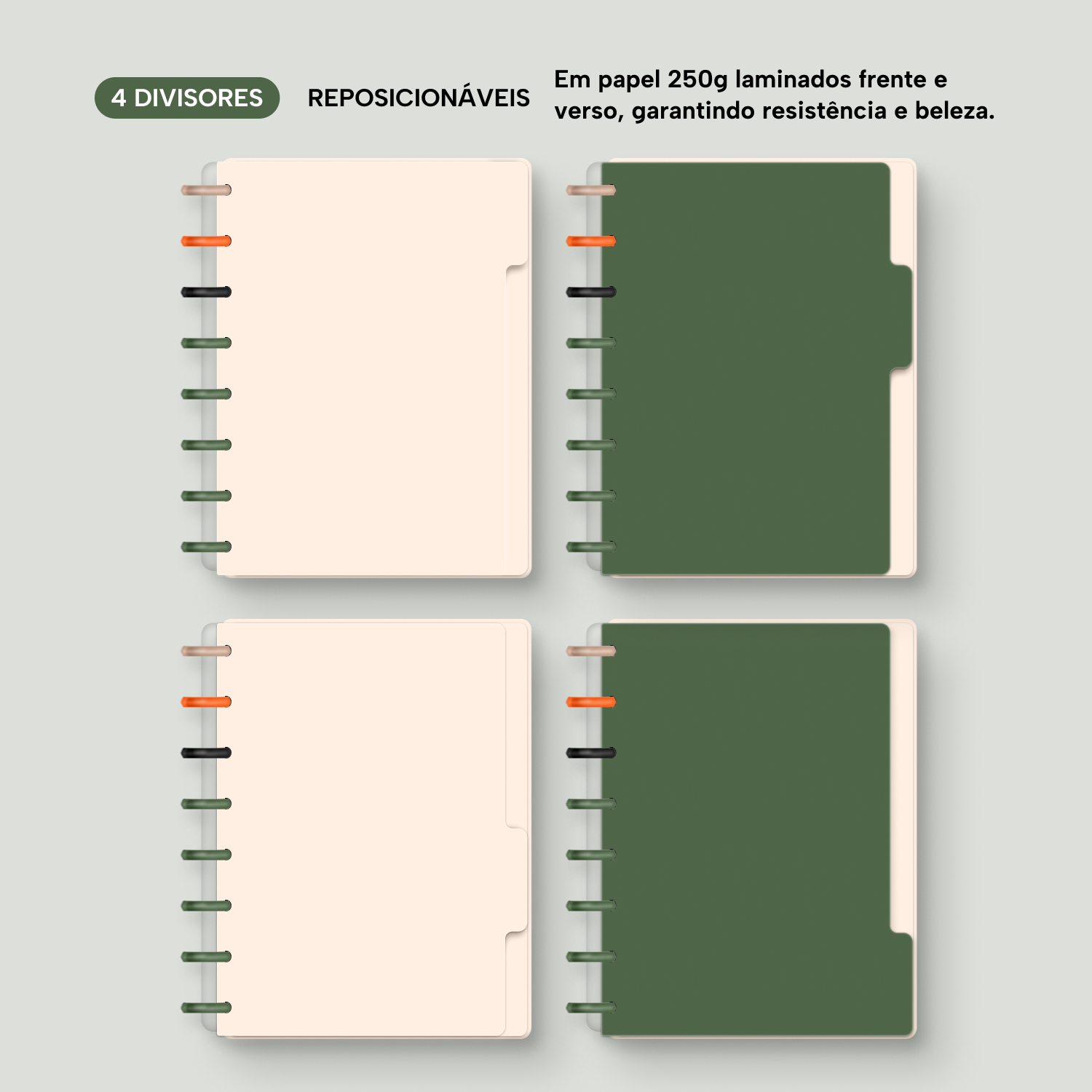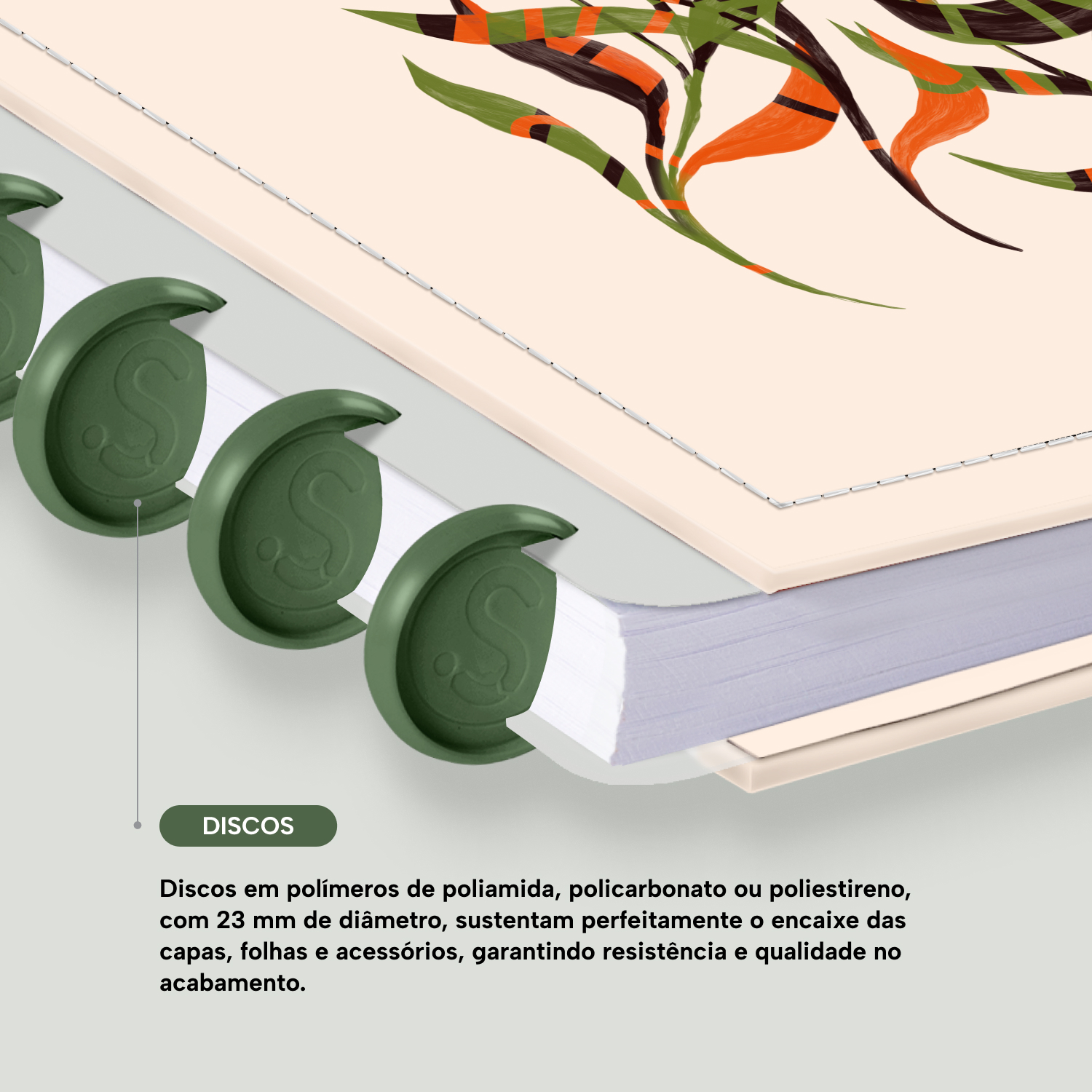Os nossos discos são fabricados em polímero de nylon e/ou policarbonato. Podem ser substituídos, proporcionando imensa variedade na combinação das cores, qualidade no acabamento e eficácia no encaixe das capas, folhas e acessórios.