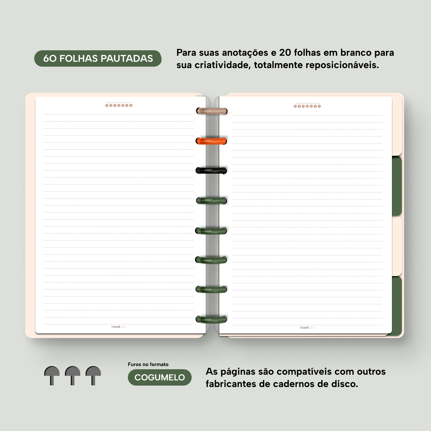Com furos no formato de “cogumelo”, você poderá dar um “up” em seu caderno com nossos refis, além de ser compatível com outros fabricantes de cadernos de discos.