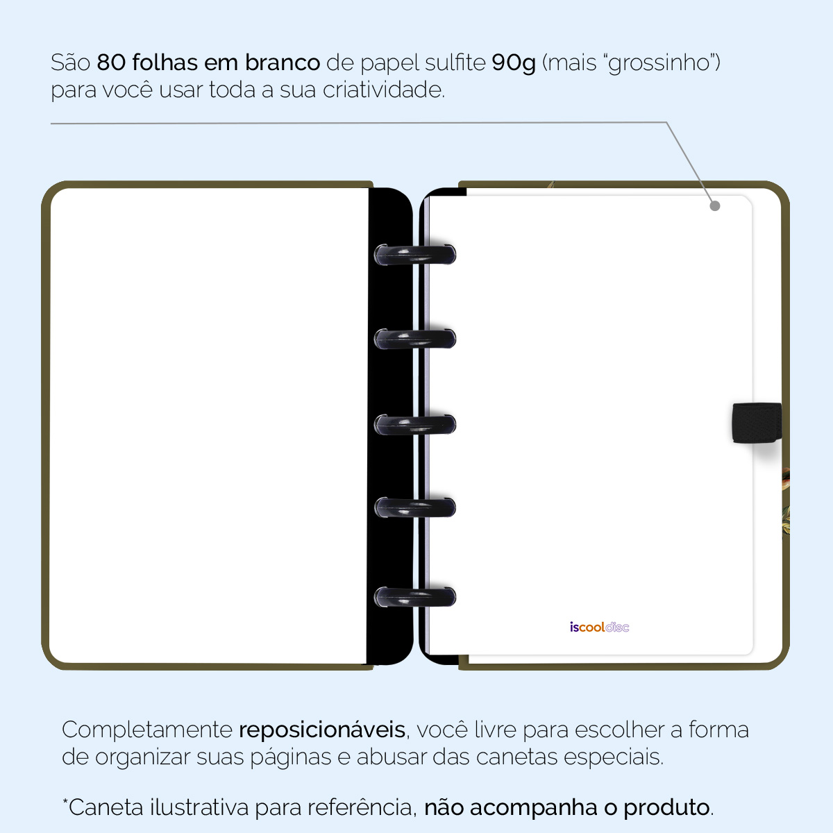 A capa é dura com impressão digital de alta definição, acompanha 6 lindas divisórias que você pode colocar em qualquer local do caderno, funcionando como o guia perfeito para sua organização.