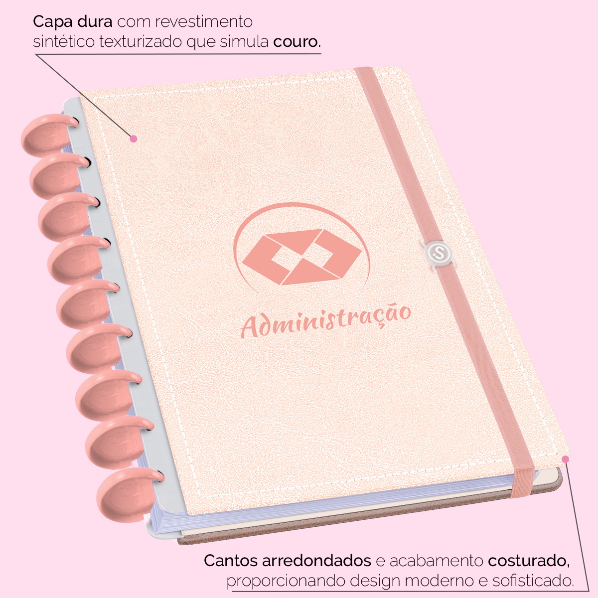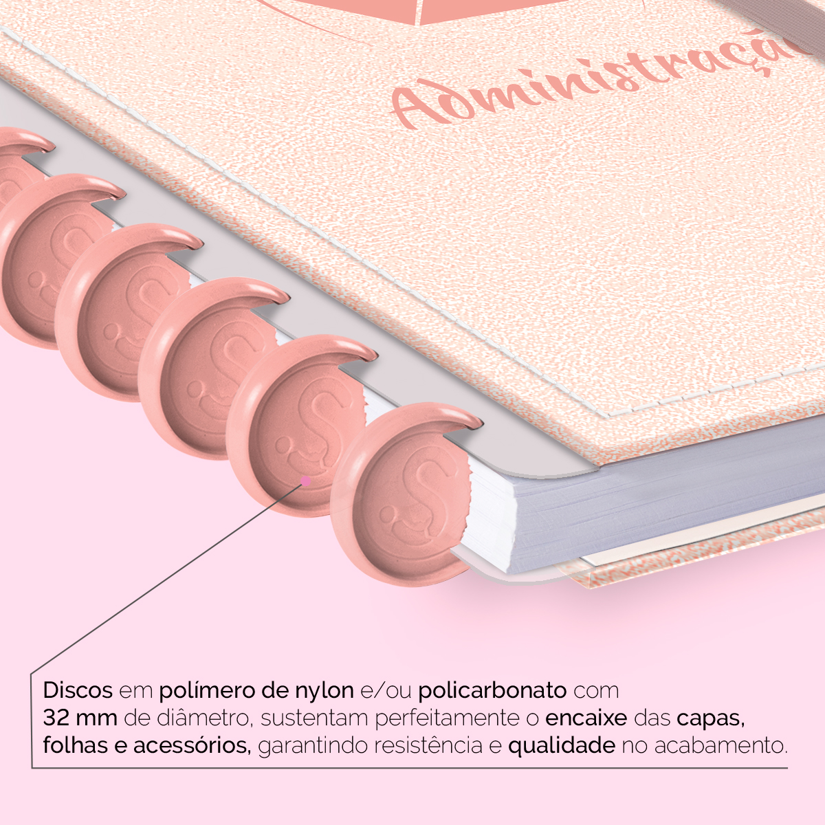Encadernado com 9 discos G de 32mm em polímero de nylon e/ou policarbonato coloridos, fabricados no Brasil.