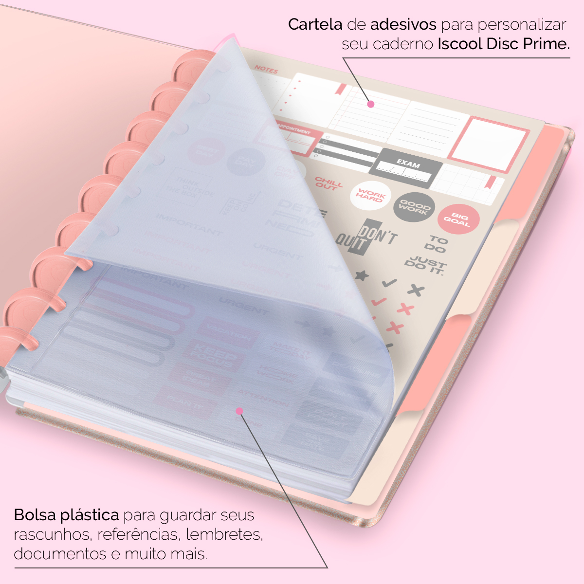Além de tudo isso, o ISCOOL DISC PRIME UNIVERSITÁRIO, conta com detalhezinhos que fazem toda diferença: elástico para fechamento da capa, muito mais estilo e privacidade para suas anotações; bolsa plástica para guardar seus rascunhos, referências, lembretes, documentos e uma cartela de adesivos incríveis, para que você possa personalizar seu caderno do seu jeitinho!