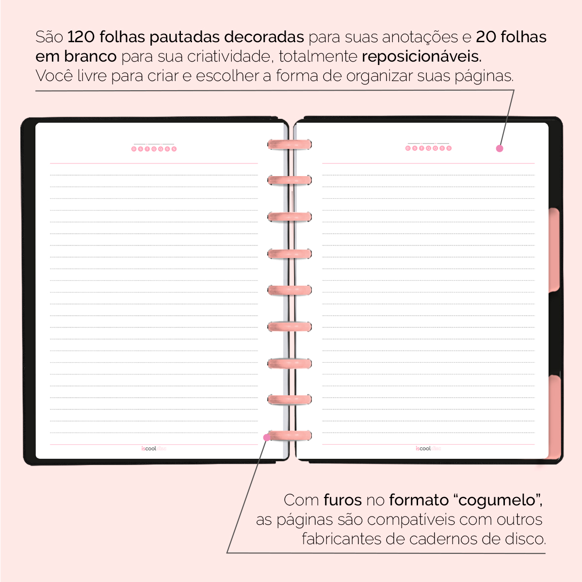 O miolo conta com 120 folhas pautadas decoradas em papel sulfite 90g, (aquele papel mais “grossinho”) para que você use e abuse das suas canetas especiais e 20 folhas em branco, ideais para explorar seu lado mais criativo ou até imprimir nelas.