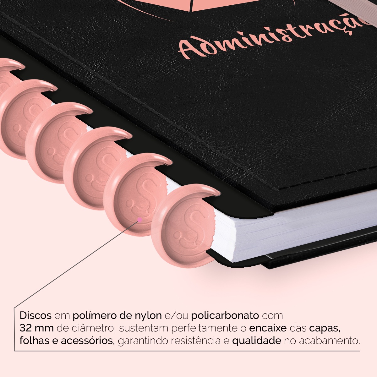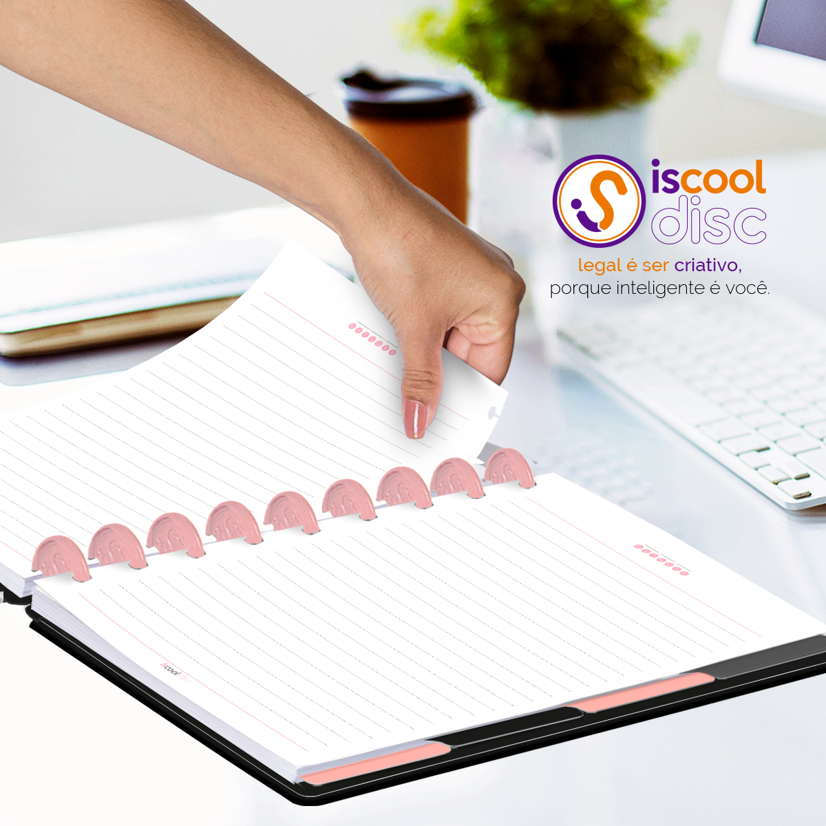 Encadernado com 11 discos G de 32mm em polímero de nylon e/ou policarbonato coloridos, fabricados no Brasil.