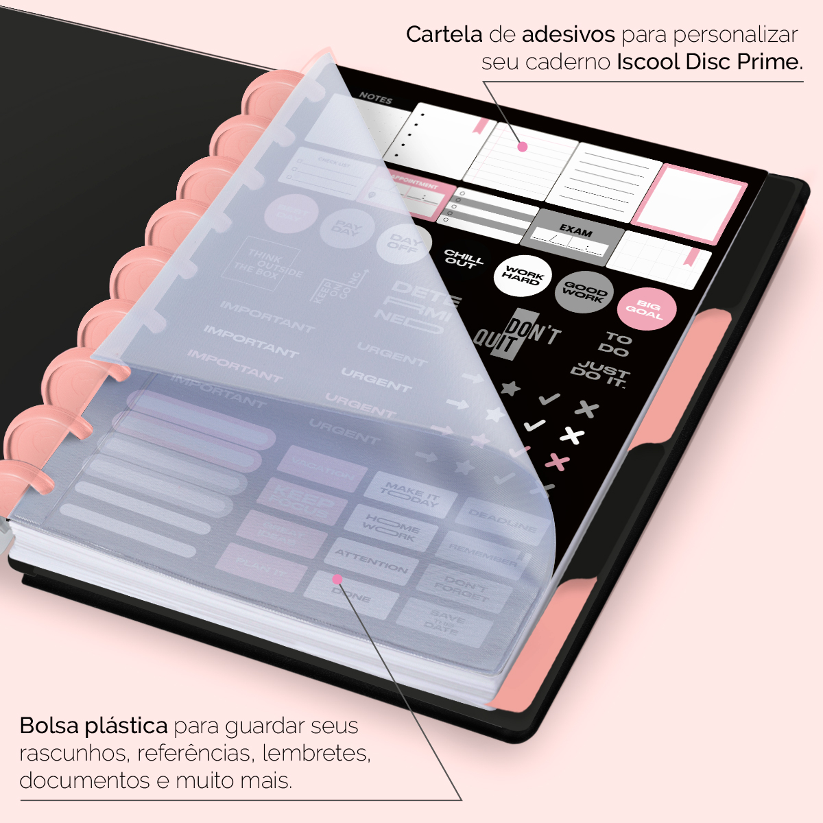 Além de tudo isso, o ISCOOL DISC PRIME UNIVERSITÁRIO, conta com detalhezinhos que fazem toda diferença: elástico para fechamento da capa, muito mais estilo e privacidade para suas anotações; bolsa plástica para guardar seus rascunhos, referências, lembretes, documentos e uma cartela de adesivos incríveis, para que você possa personalizar seu caderno do seu jeitinho!