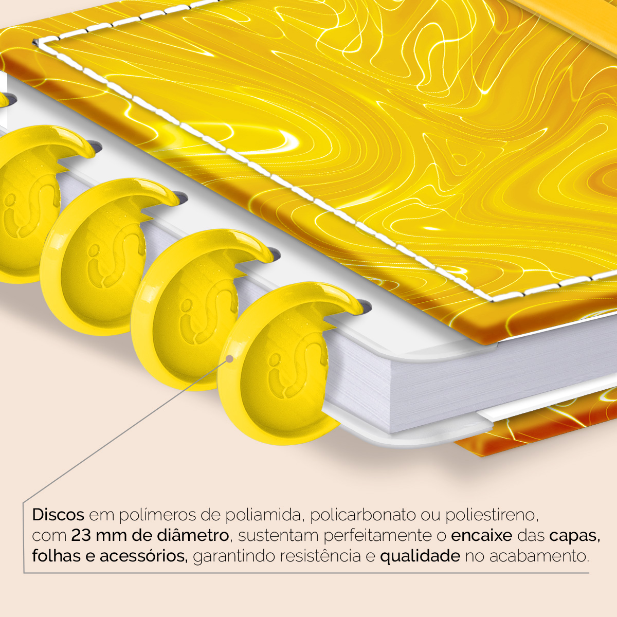 Os nossos discos são fabricados em polímero de nylon e/ou policarbonato, podem ser substituídos, proporcionando imensa variedade na combinação das cores, qualidade no acabamento e eficácia no encaixe das capas, folhas e acessórios.