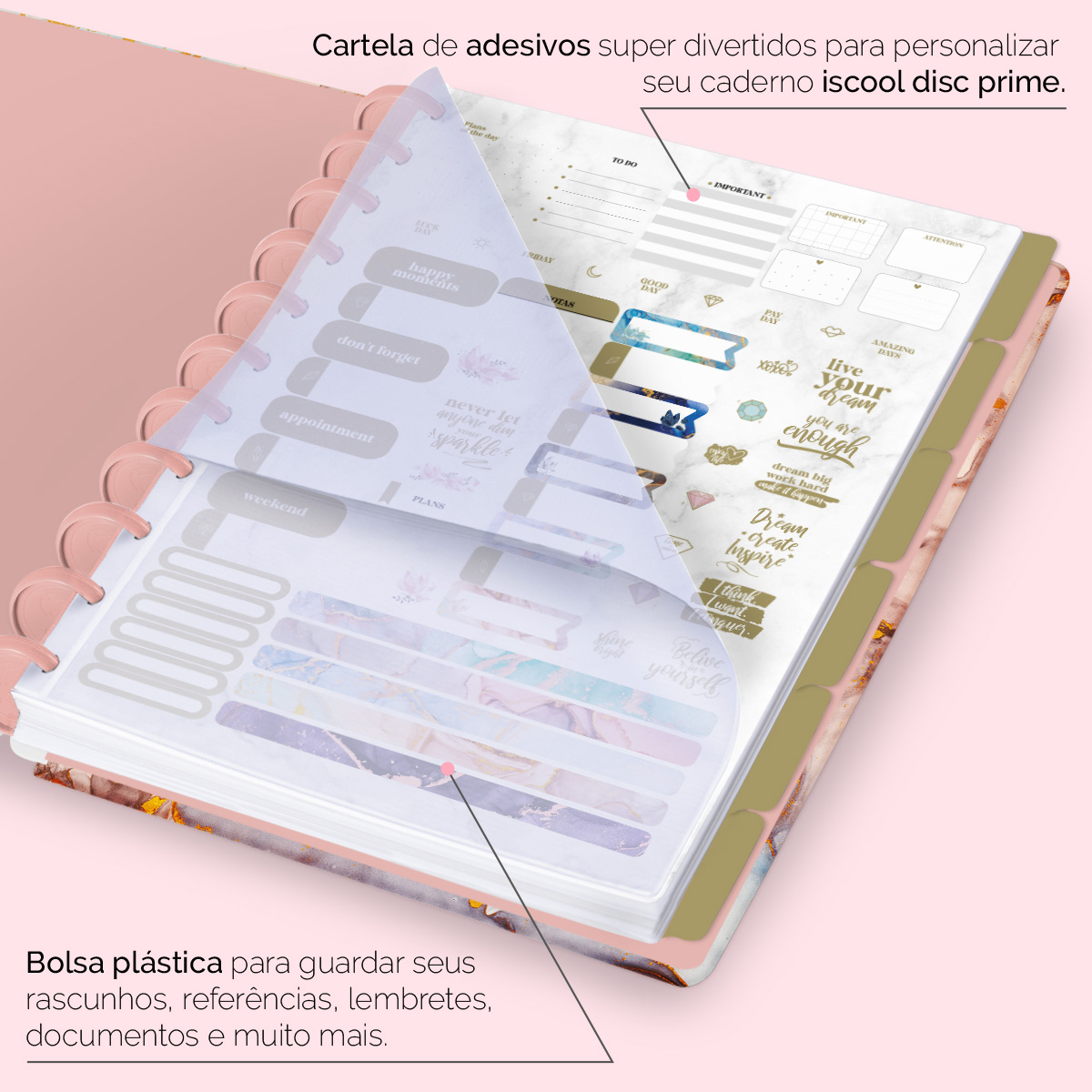 Além de tudo isso, o ISCOOL DISC PRIME, conta com detalhezinhos que fazem toda diferença: elástico para fechamento da capa, muito mais estilo e privacidade para suas anotações; bolsa plástica para guardar seus rascunhos, referências, lembretes, documentos e uma cartela de adesivos incríveis, para que você possa personalizar seu caderno do seu jeitinho!