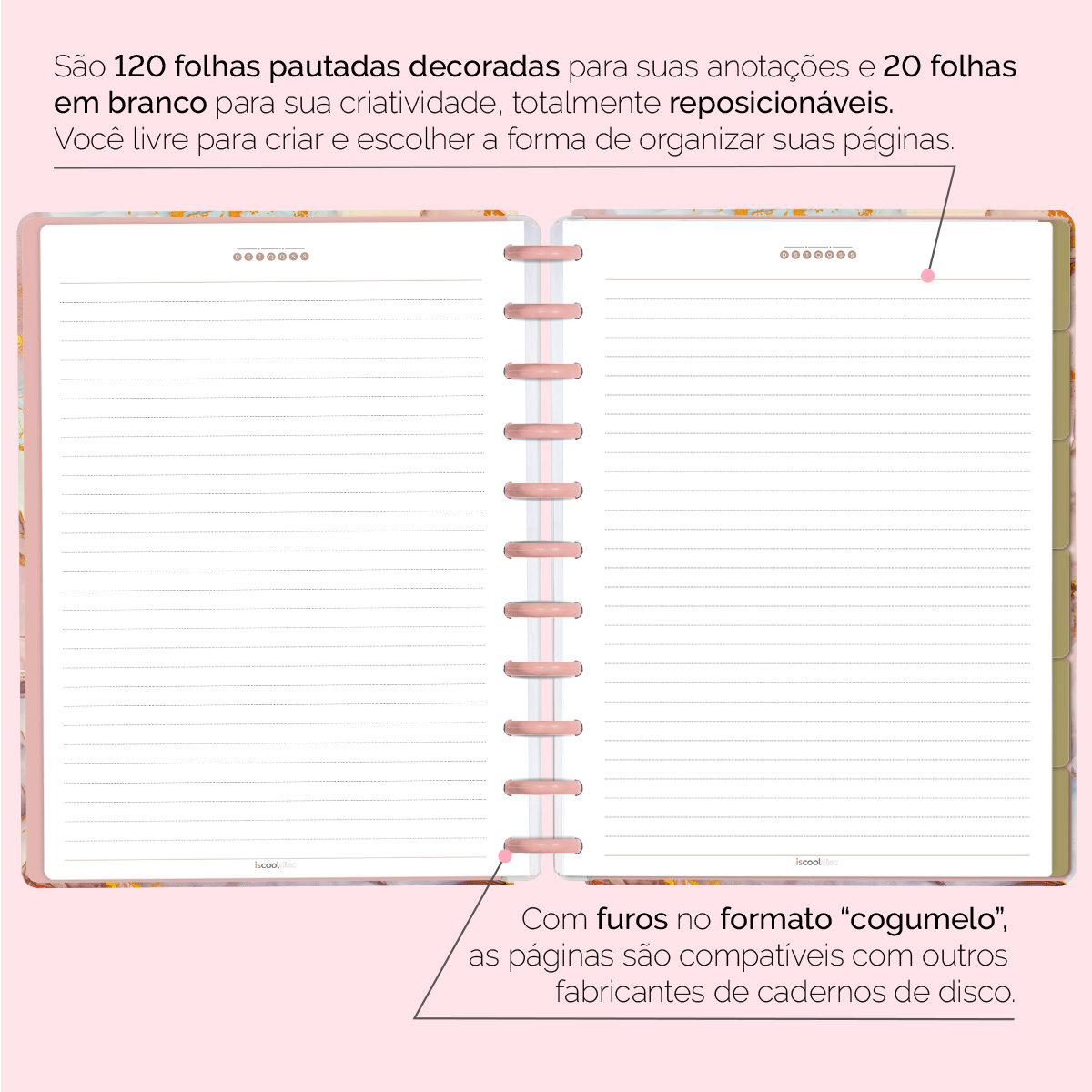 Com furos no formato de “cogumelo”, você poderá dar um “up” em seu caderno com nossos refis, além de ser compatível com outros fabricantes de cadernos de discos.