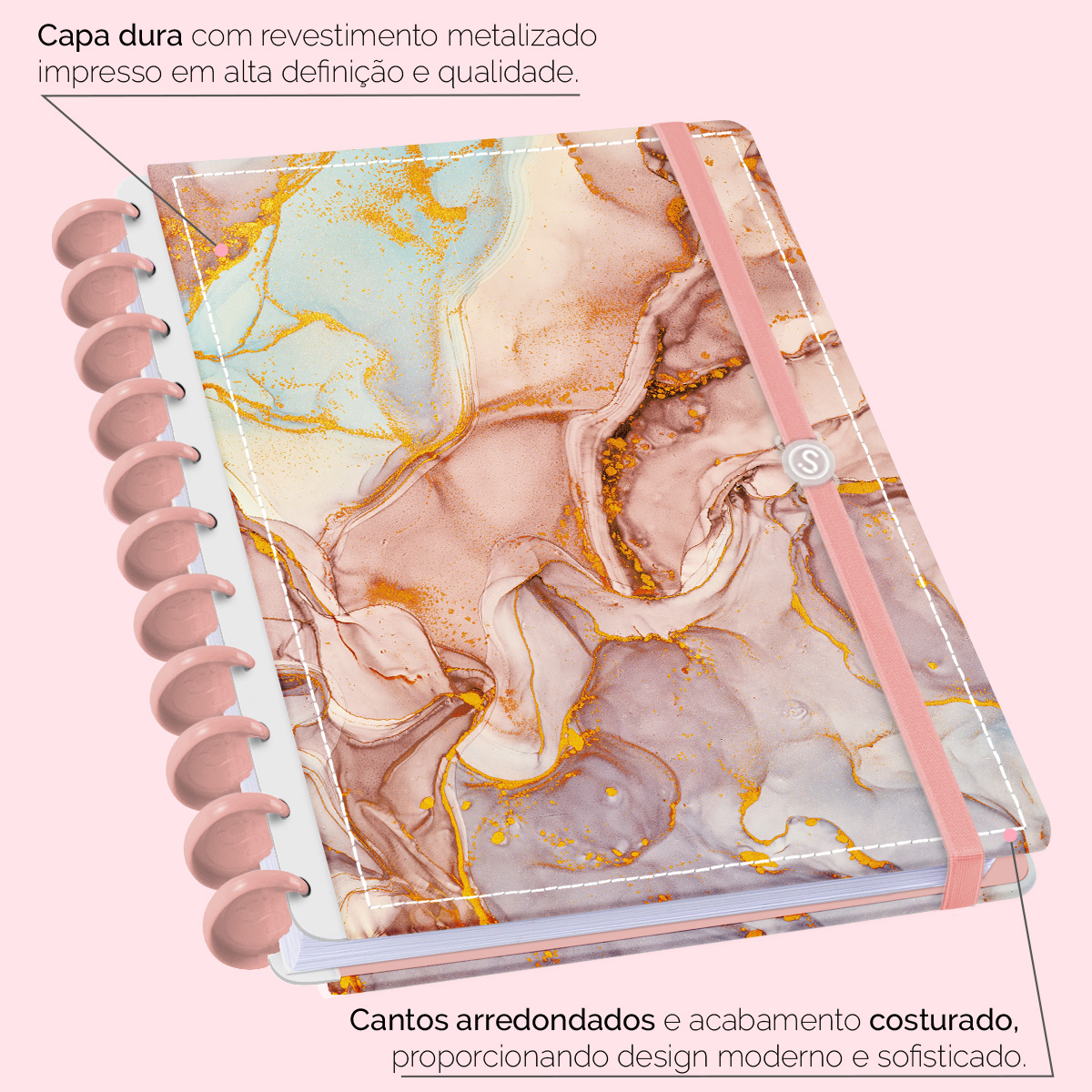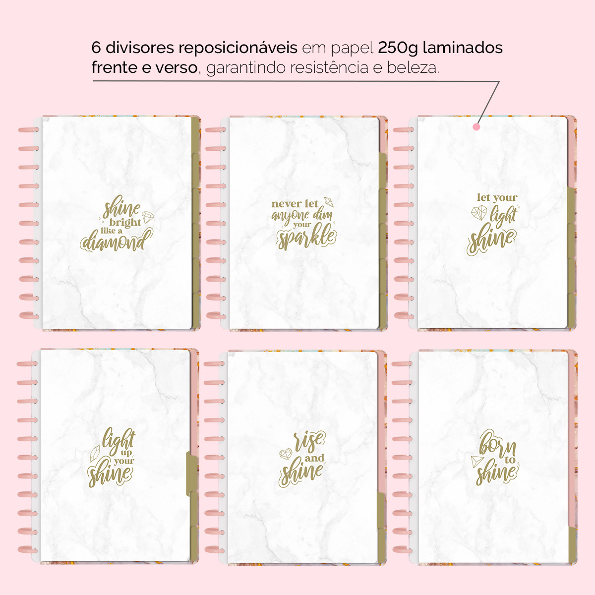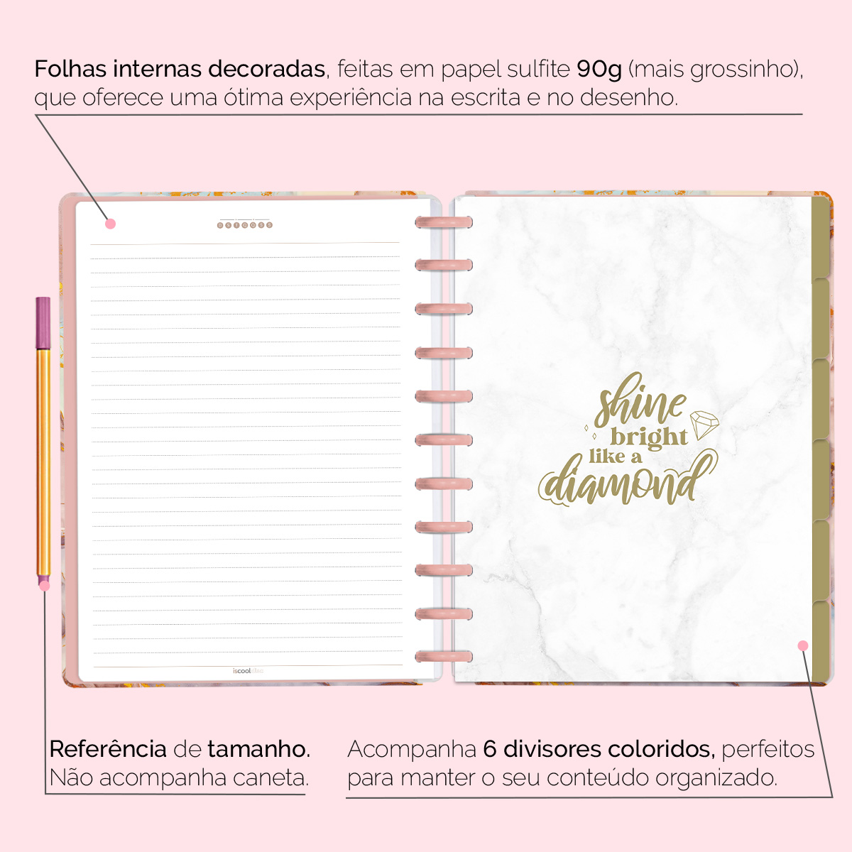 A capa é dura com impressão digital de alta definição, acompanha 6 lindas divisórias que você pode colocar em qualquer local do caderno, funcionando como o guia perfeito para sua organização.