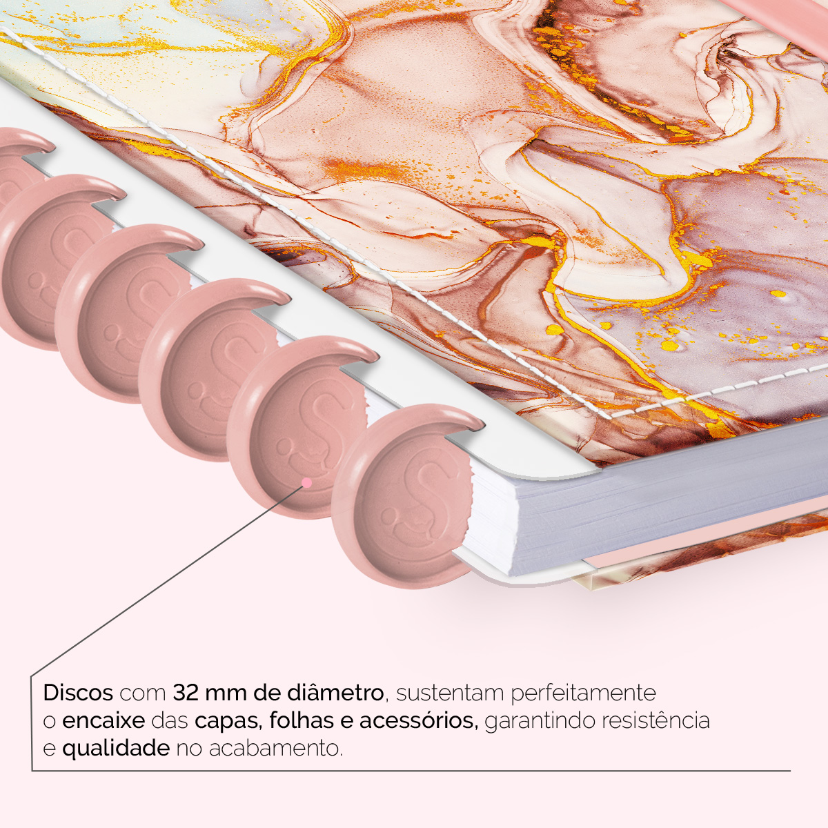 Os nossos discos são fabricados em polímero de nylon e/ou policarbonato, podem ser substituídos, proporcionando imensa variedade na combinação das cores, qualidade no acabamento e eficácia no encaixe das capas, folhas e acessórios.