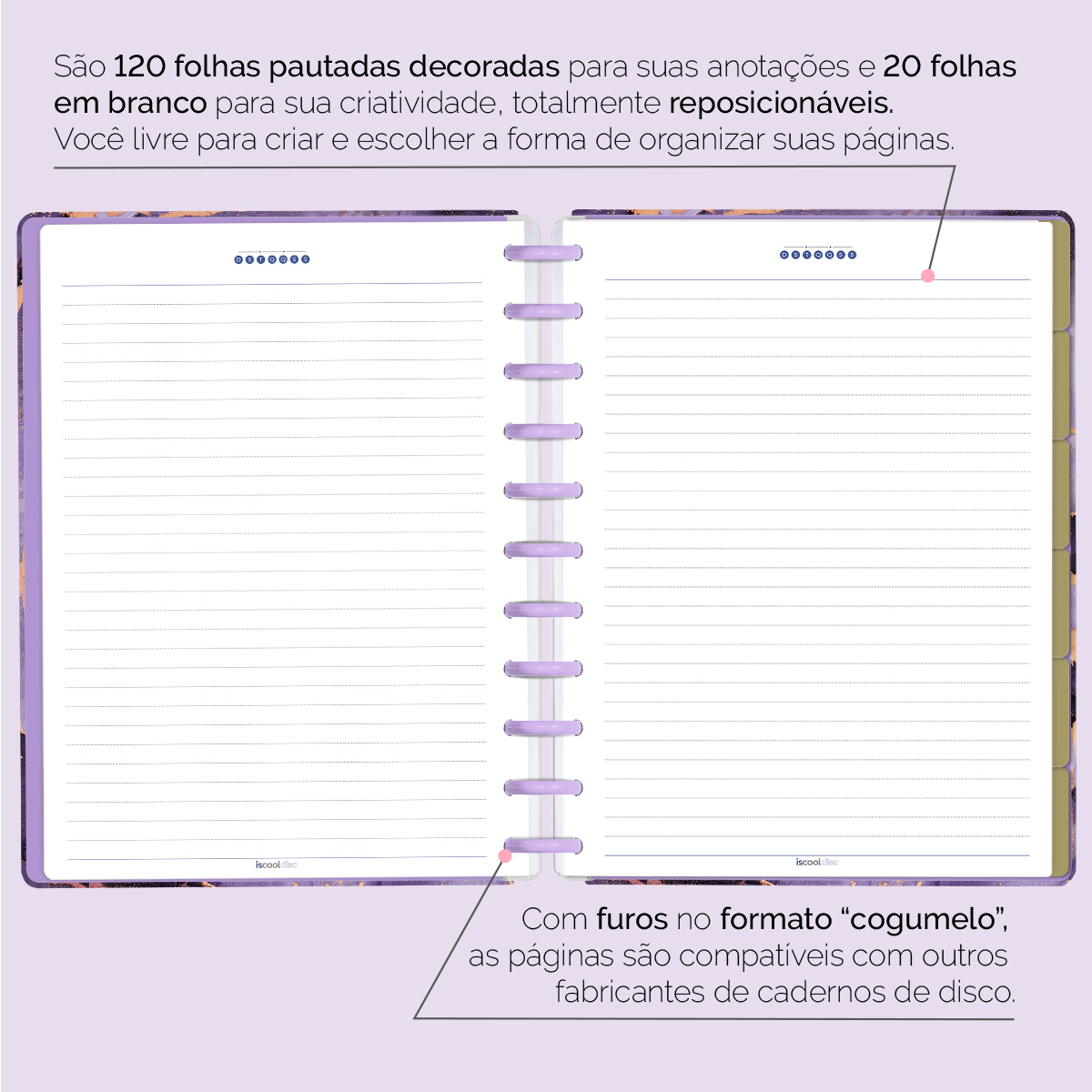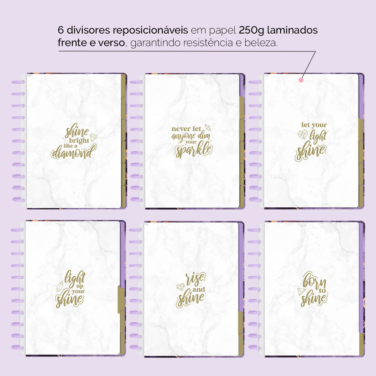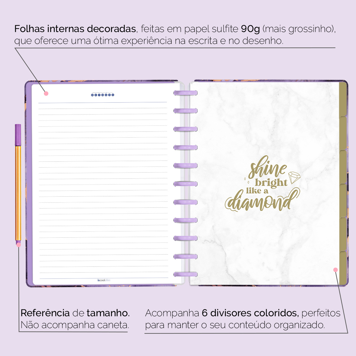 A capa é dura com impressão digital de alta definição, acompanha 6 lindas divisórias que você pode colocar em qualquer local do caderno, funcionando como o guia perfeito para sua organização.