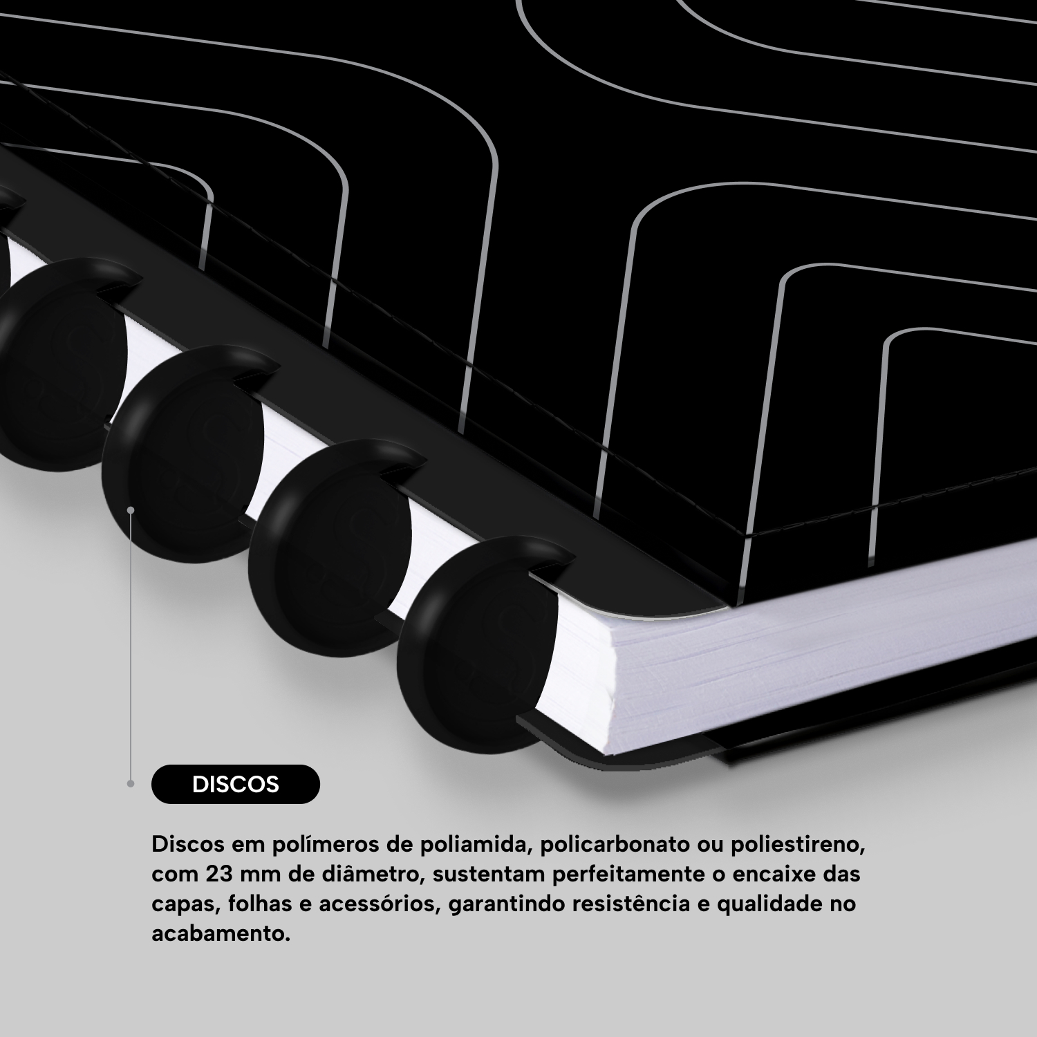 Encadernado com 11 discos M de 23mm em polímero de nylon e/ou policarbonato coloridos, fabricados no Brasil.