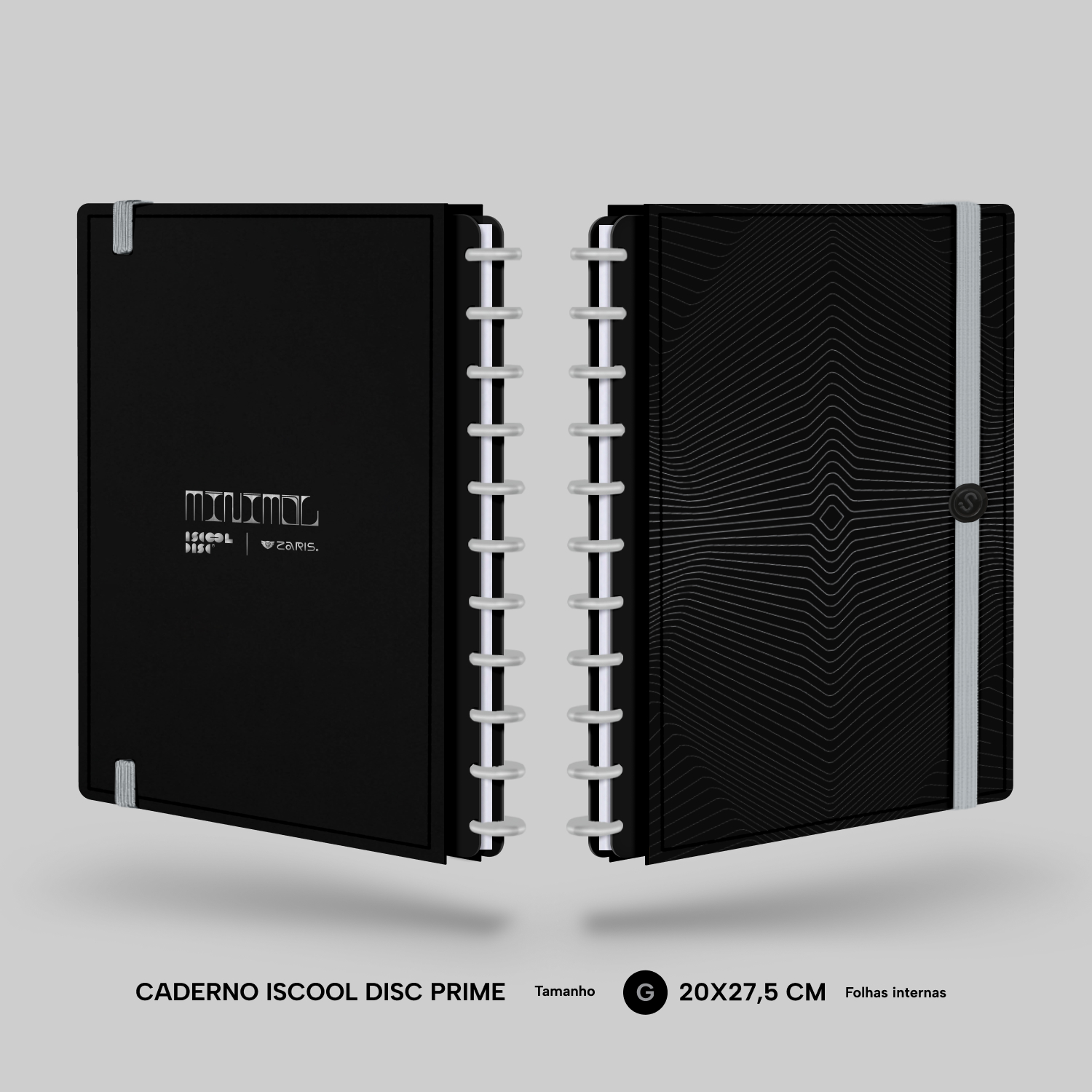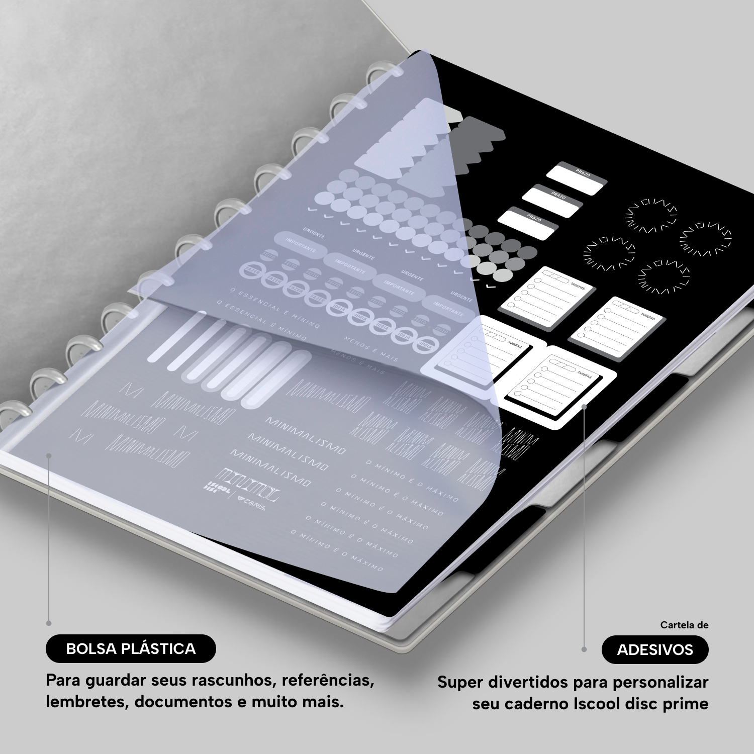 Além de tudo isso, o iscooldisc Prime conta com detalhes que fazem toda a diferença: elástico para fechamento da capa, muito mais estilo e privacidade para suas anotações; bolsa plástica para guardar seus rascunhos, referências, lembretes, documentos e uma cartela de adesivos incríveis, para que você possa personalizar seu caderno do seu jeitinho!