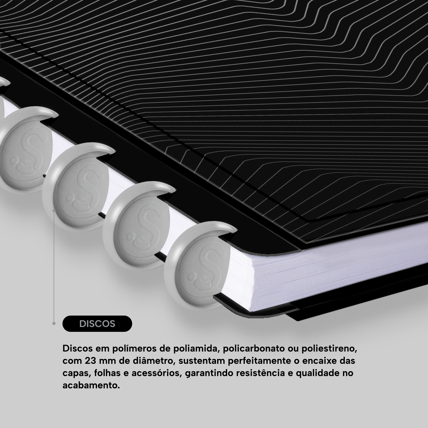 Encadernado com 11 discos M de 23mm em polímero de nylon e/ou policarbonato coloridos, fabricados no Brasil.