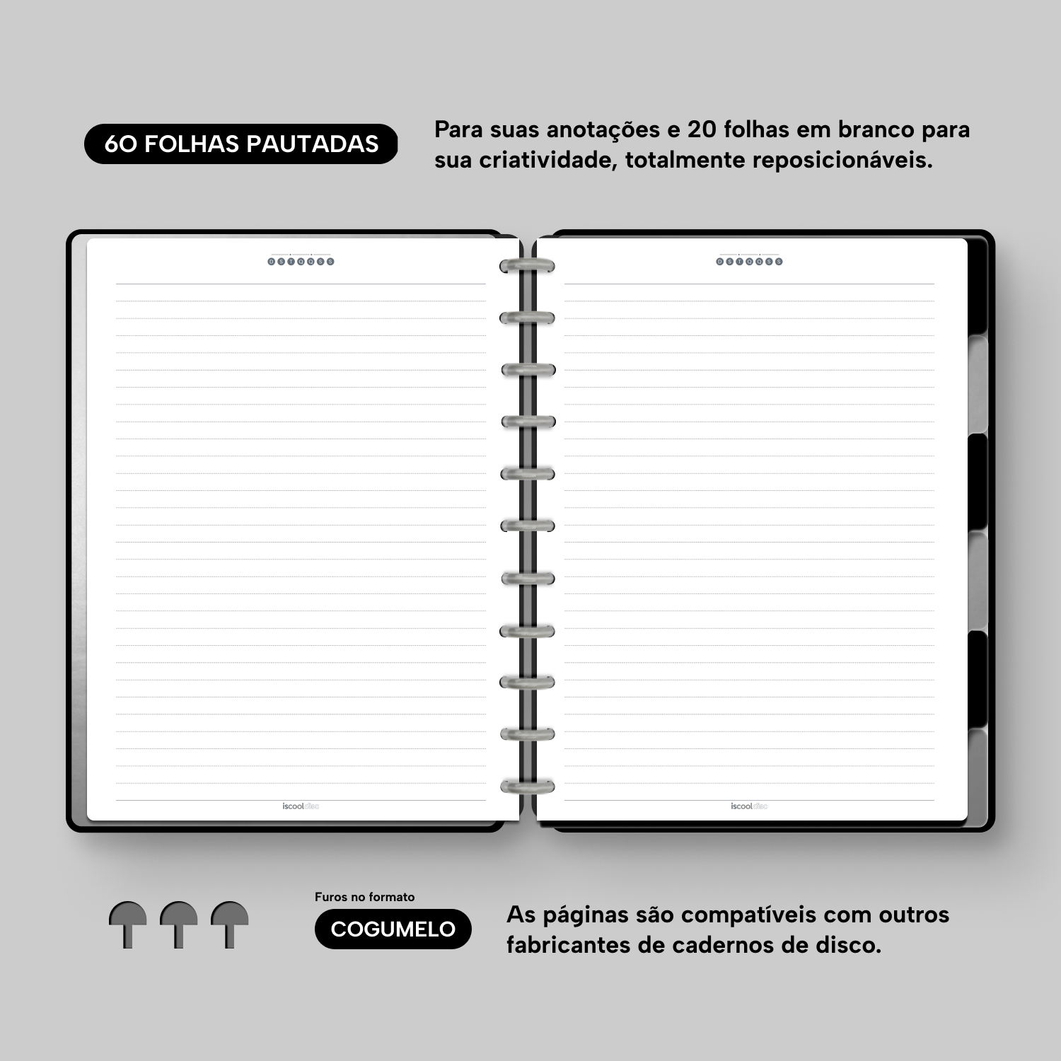 O miolo conta com 60 folhas pautadas decoradas em papel sulfite 90g (aquele papel mais “grossinho”) para que você use e abuse das suas canetas especiais, e 20 folhas em branco, ideais para explorar seu lado mais criativo ou até imprimir nelas.