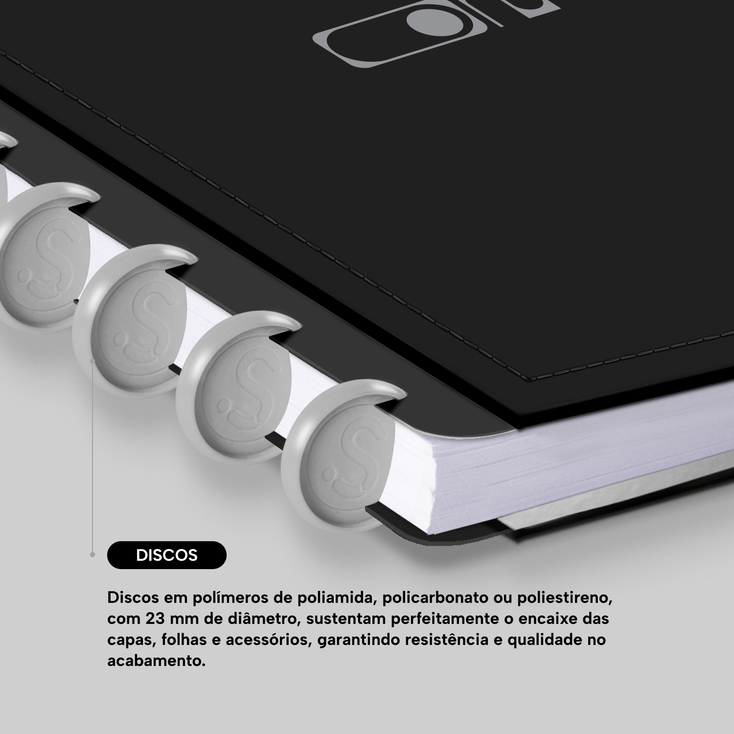 Encadernado com 11 discos M de 23mm em polímero de nylon e/ou policarbonato coloridos, fabricados no Brasil.