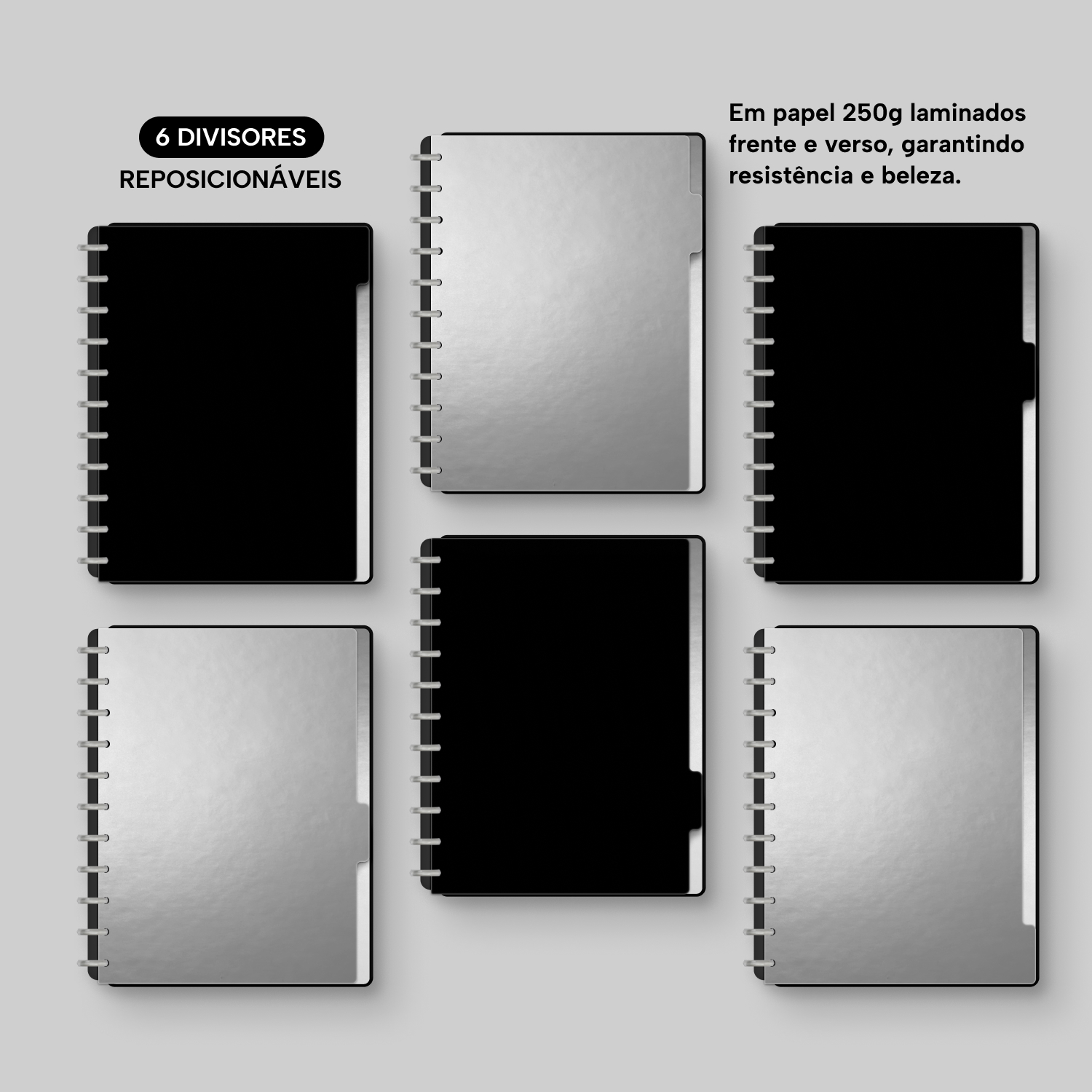 A capa é dura, com impressão digital de alta definição, e acompanha 6 lindas divisórias que você pode colocar em qualquer local do caderno, funcionando como o guia perfeito para sua organização.