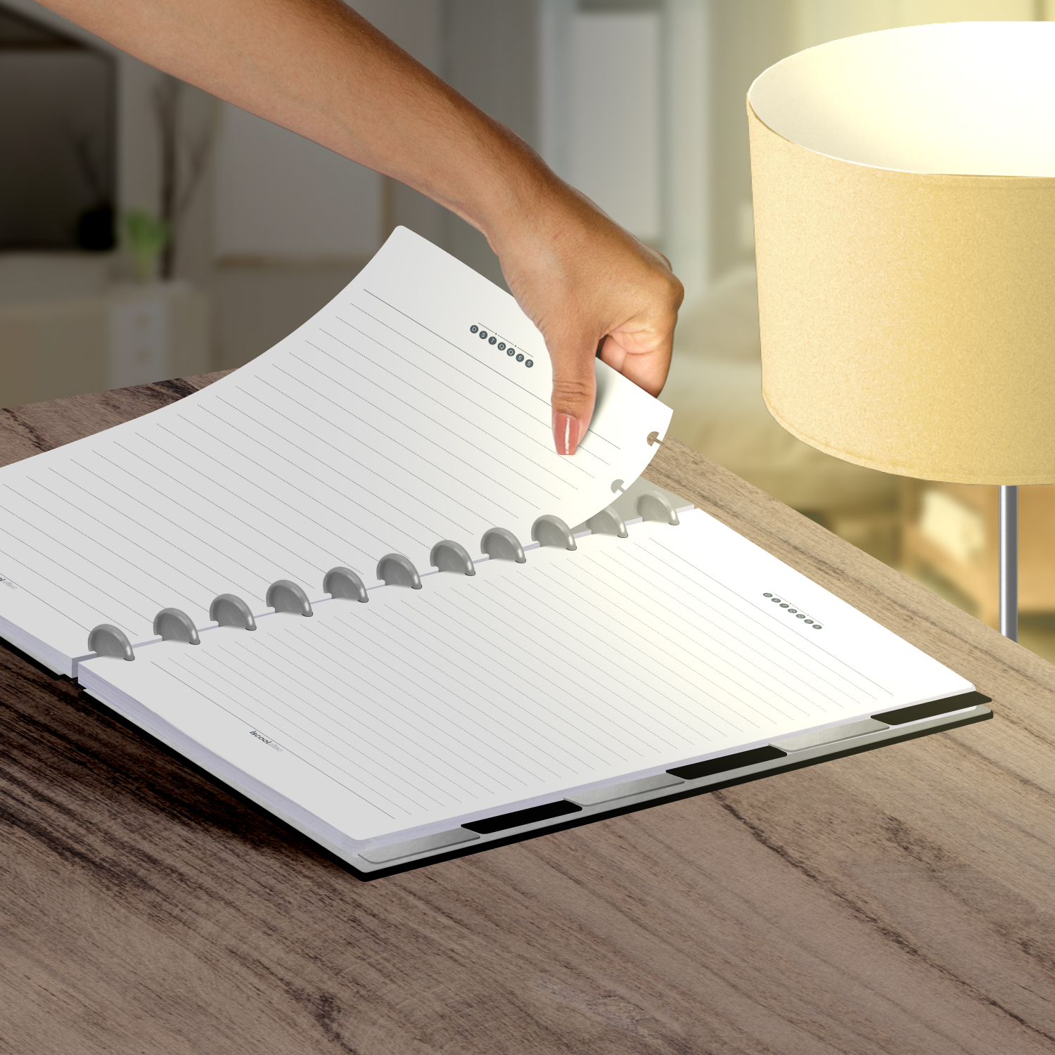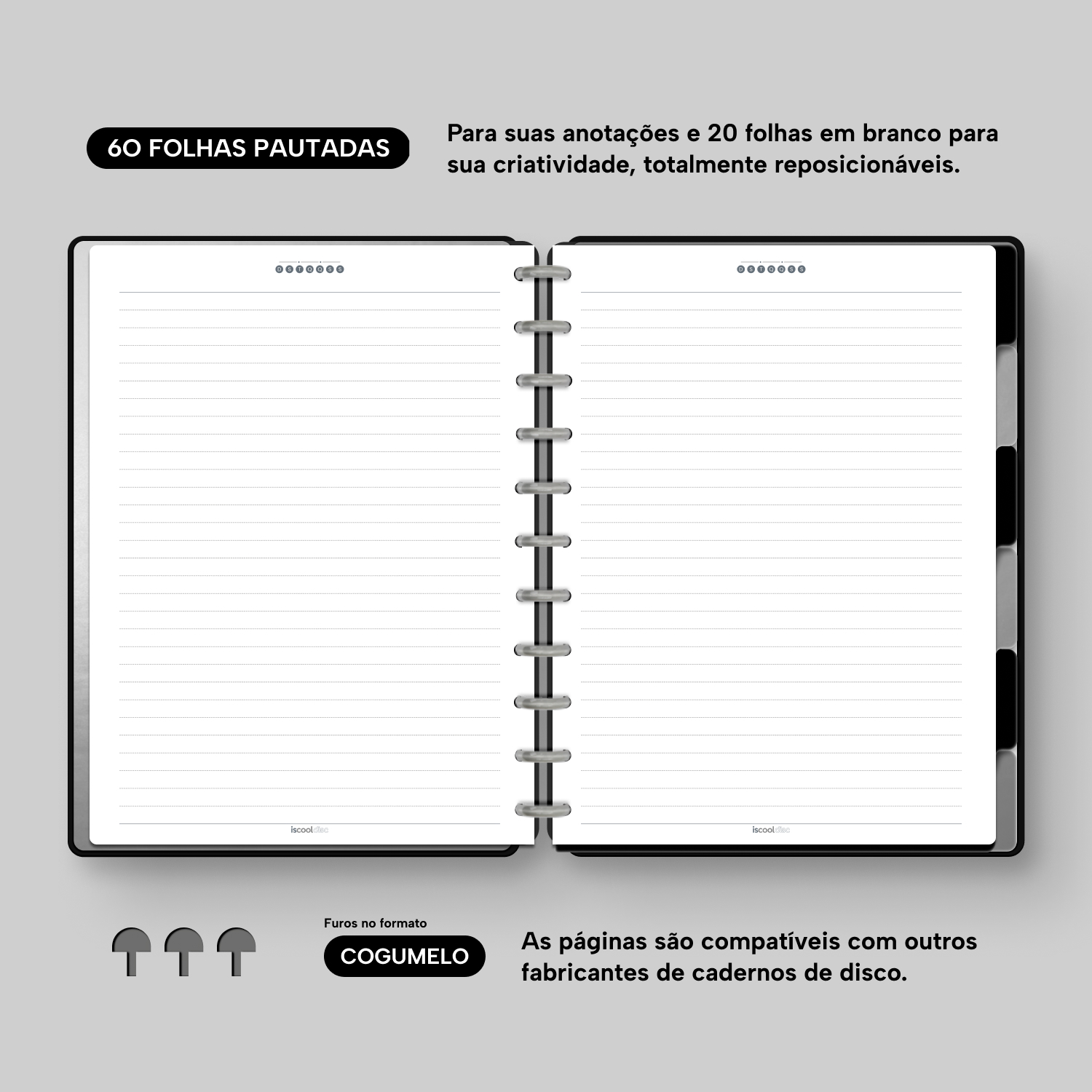 Com furos no formato de “cogumelo”, você poderá dar um “up” em seu caderno com nossos refis, além de ser compatível com outros fabricantes de cadernos de discos.