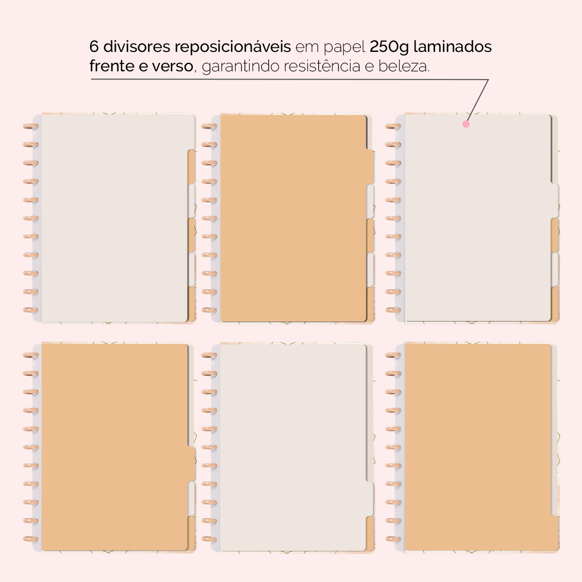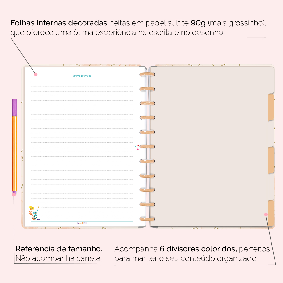 A capa é dura com impressão digital de alta definição, acompanha 6 lindas divisórias que você pode colocar em qualquer local do caderno, funcionando como o guia perfeito para sua organização.