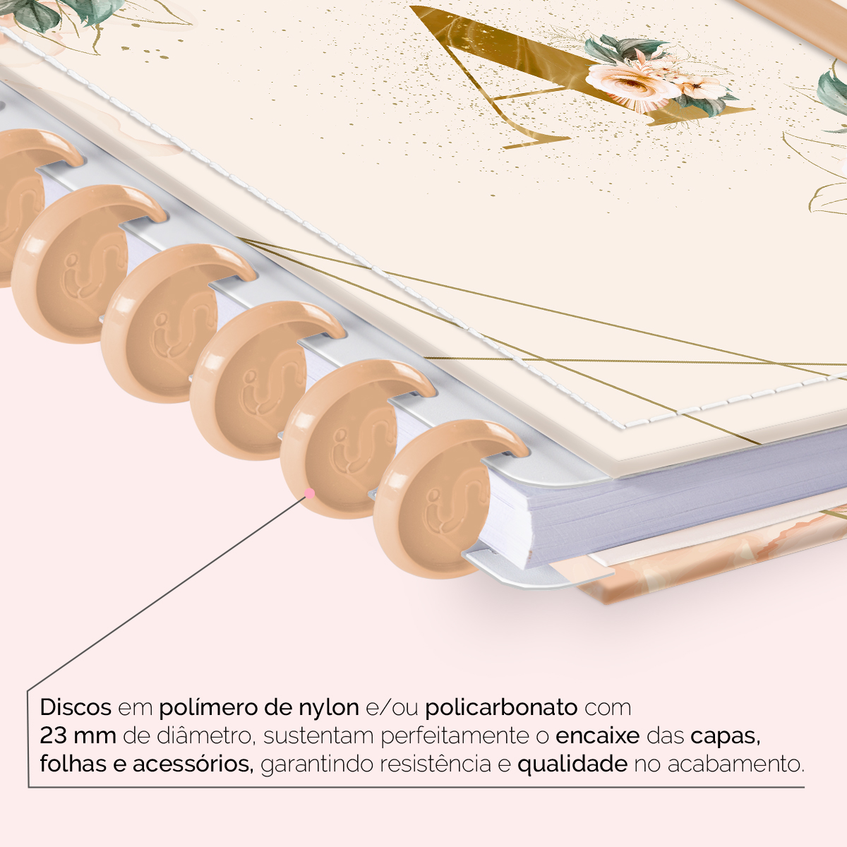 Encadernado com 11 discos M de 23mm em polímero de nylon e/ou policarbonato coloridos, fabricados no Brasil.