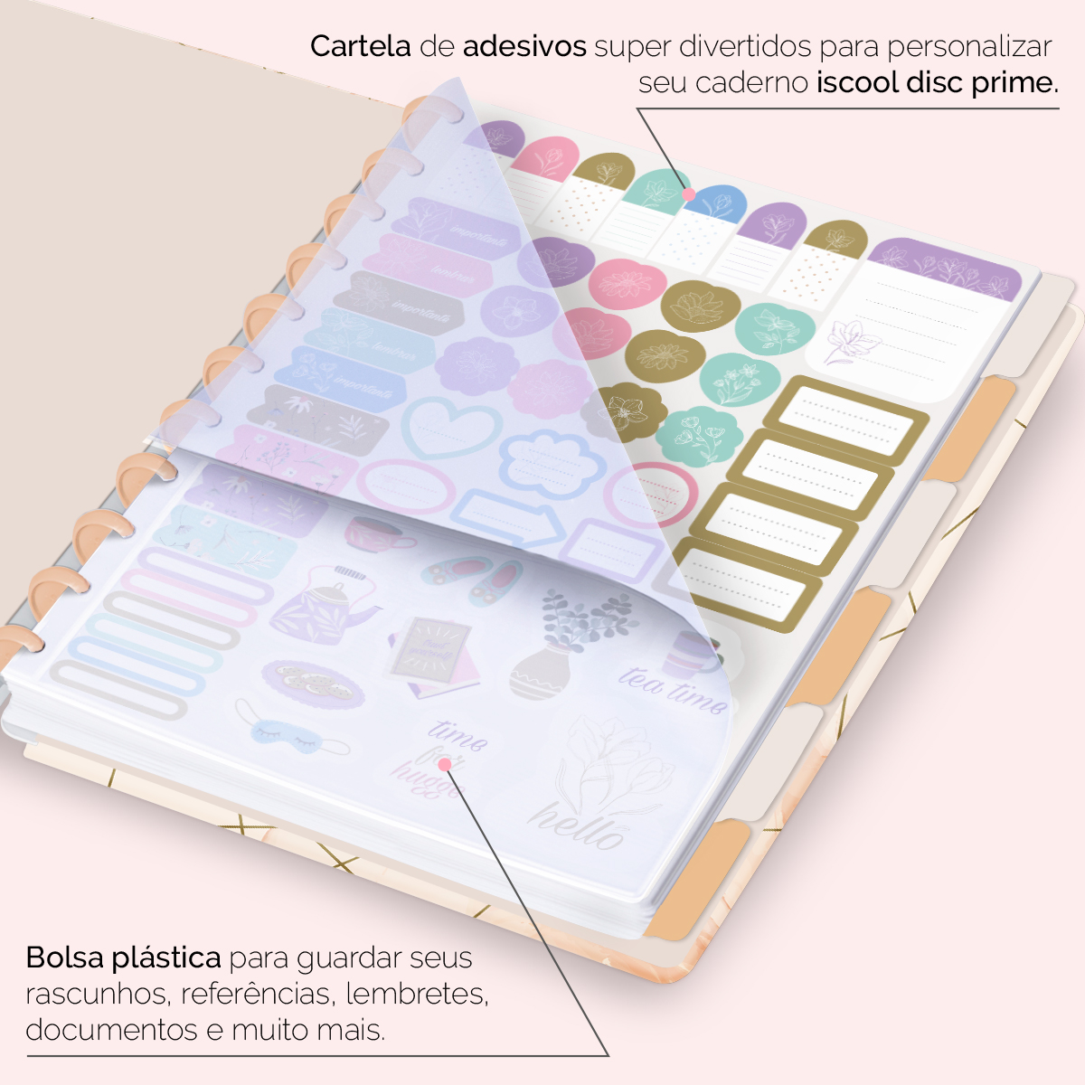 Além de tudo isso, o ISCOOL DISC PRIME, conta com detalhezinhos que fazem toda diferença: elástico para fechamento da capa, muito mais estilo e privacidade para suas anotações; bolsa plástica para guardar seus rascunhos, referências, lembretes, documentos e uma cartela de adesivos incríveis, para que você possa personalizar seu caderno do seu jeitinho!