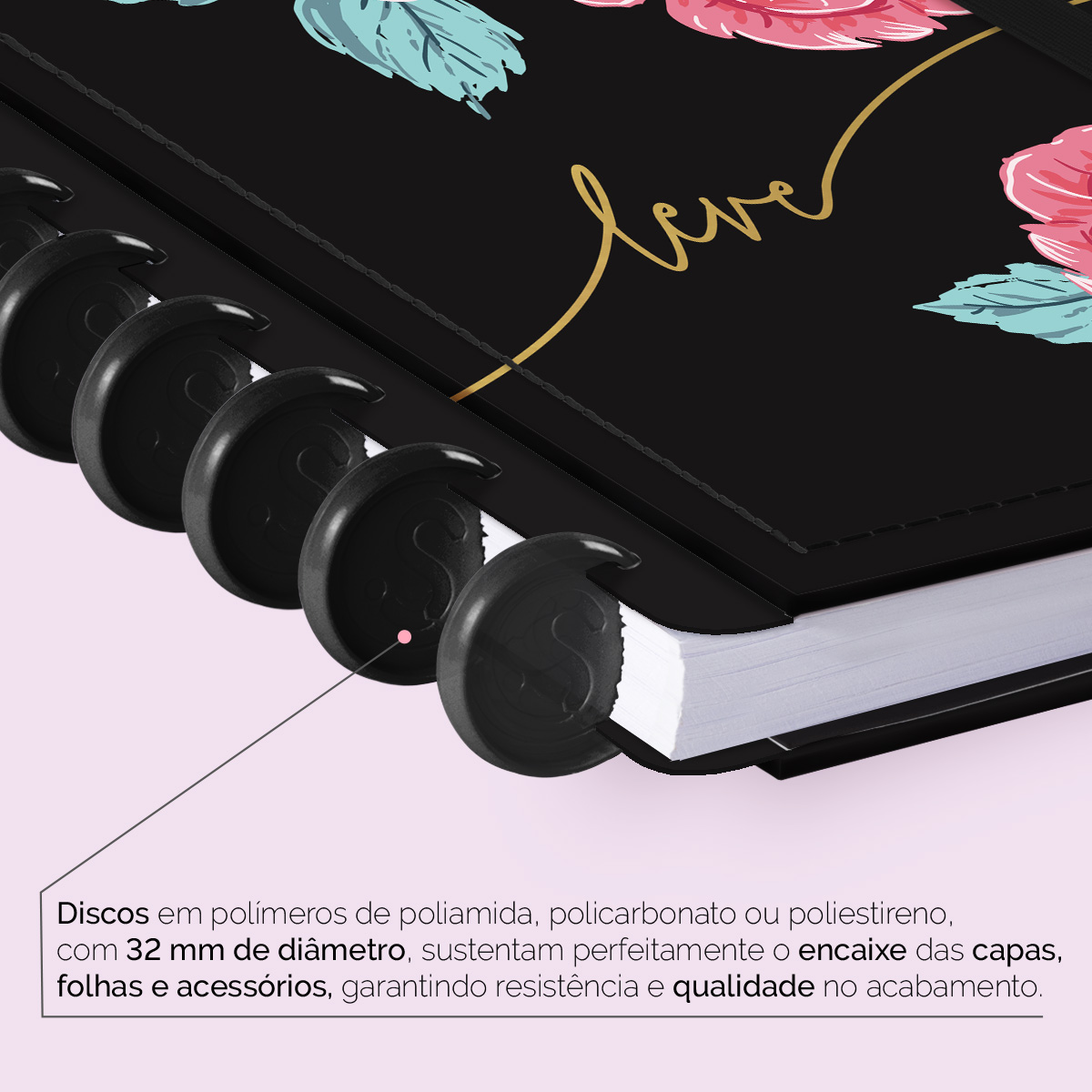 Encadernado com 11 discos M de 23mm em polímero de nylon e/ou policarbonato, fabricados no Brasil.