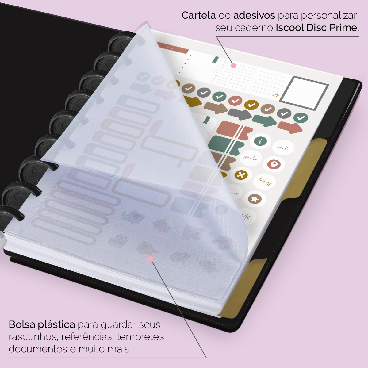 Além de tudo isso, o iscooldisc Prime Blackout, conta com detalhezinhos que fazem toda diferença: elástico para fechamento da capa, muito mais estilo e privacidade para suas anotações; bolsa plástica para guardar seus rascunhos, referências, lembretes, documentos e uma cartela de adesivos incríveis, para que você possa personalizar seu caderno do seu jeitinho!