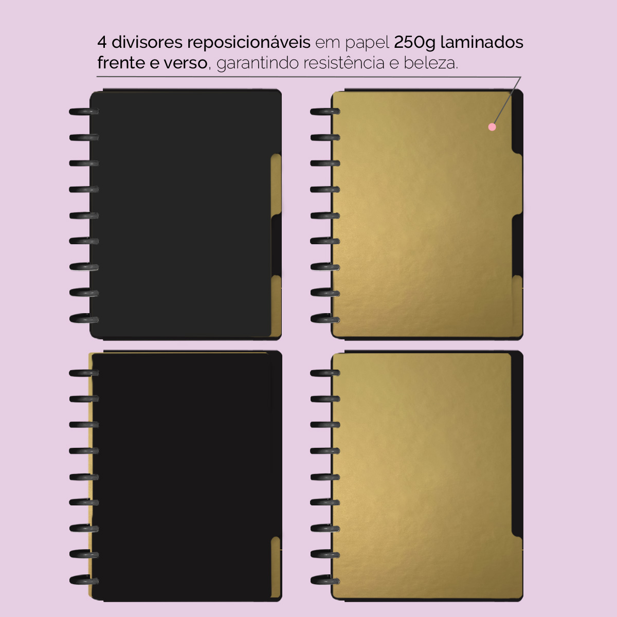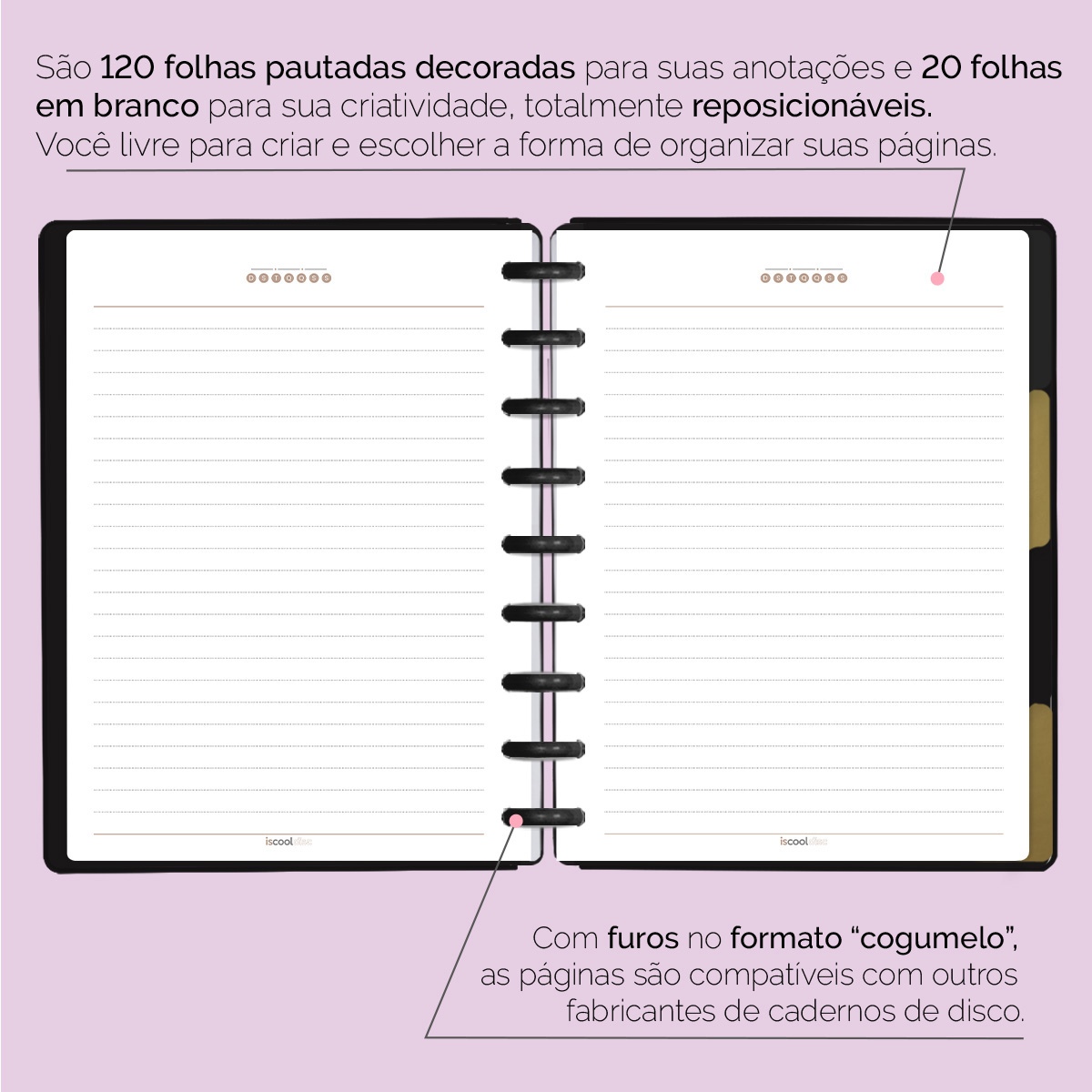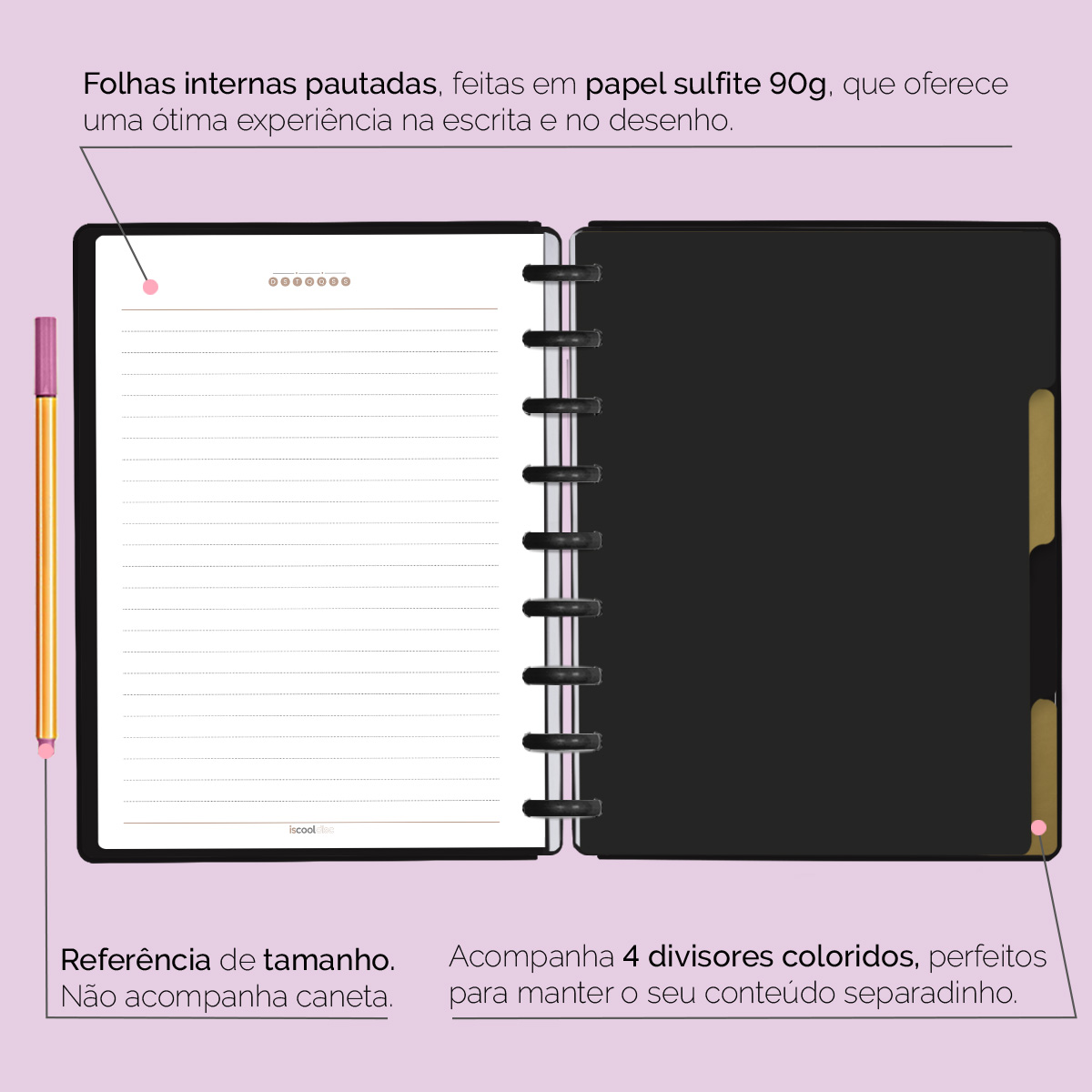 A capa é dura com impressão digital de alta definição, acompanha 6 lindas divisórias que você pode colocar em qualquer local do caderno, funcionando como o guia perfeito para sua organização.