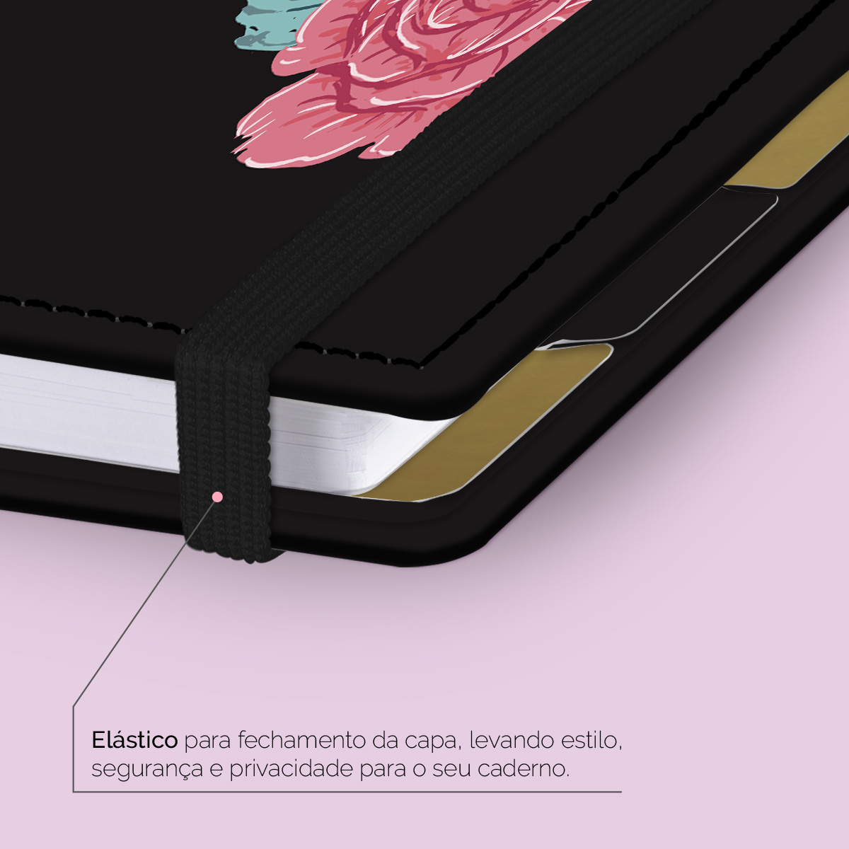 O miolo conta com 30 folhas pautadas em papel sulfite 120g 100% preto (aquele papel ainda mais “grossinho”) para que você use e abuse das suas canetas especiais e 30 folhas pontilhadas black, ideais para explorar seu lado mais criativo ou fazer bullet journal.