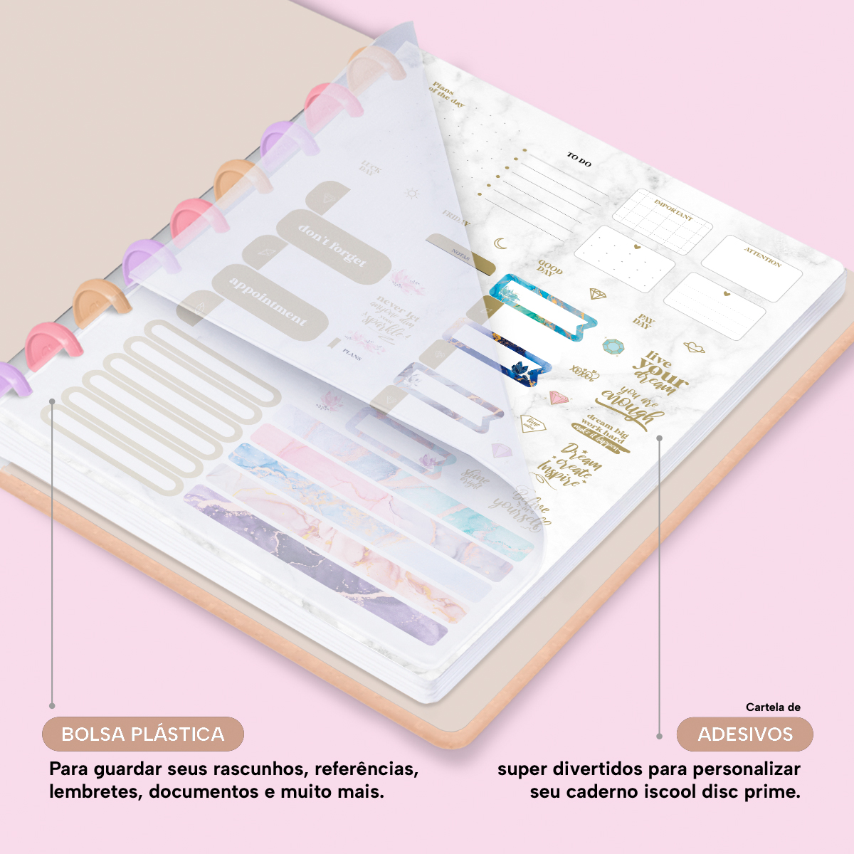 Além de tudo isso, o Iscool Disc Planner Datado 2026 conta com detalhes que fazem toda a diferença: elástico para fechamento da capa, proporcionando muito mais estilo e privacidade para suas anotações; e uma cartela de adesivos incríveis para que você possa personalizar o planner do seu jeitinho!