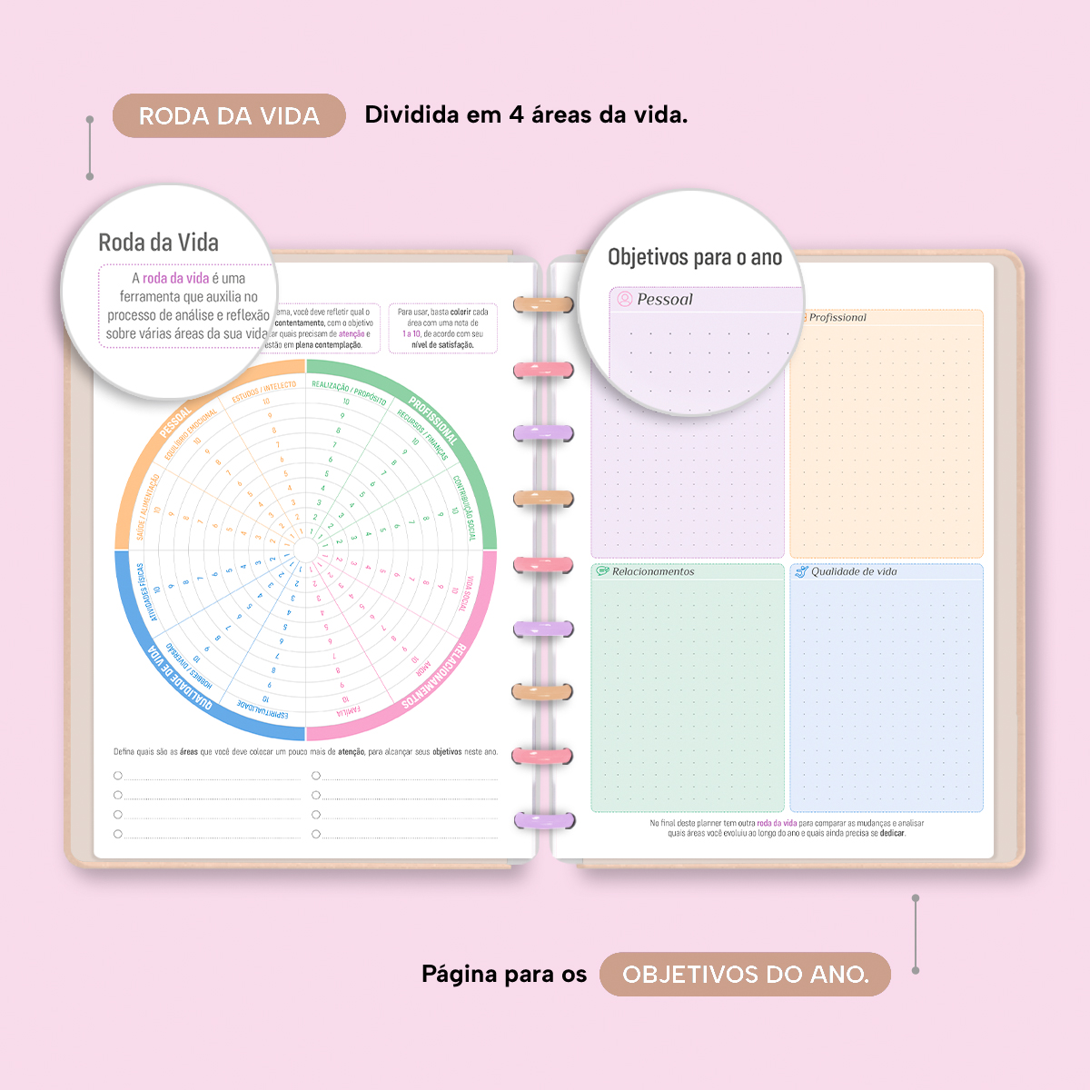 No início de cada mês, há um planejamento mensal, facilitando visualmente as suas principais anotações, um "Habit Tracker" para você desenvolver novos hábitos ou controlar os mais importantes, e ainda um planejamento financeiro, facilitando o controle das suas receitas e despesas, além de inúmeras outras funcionalidades.