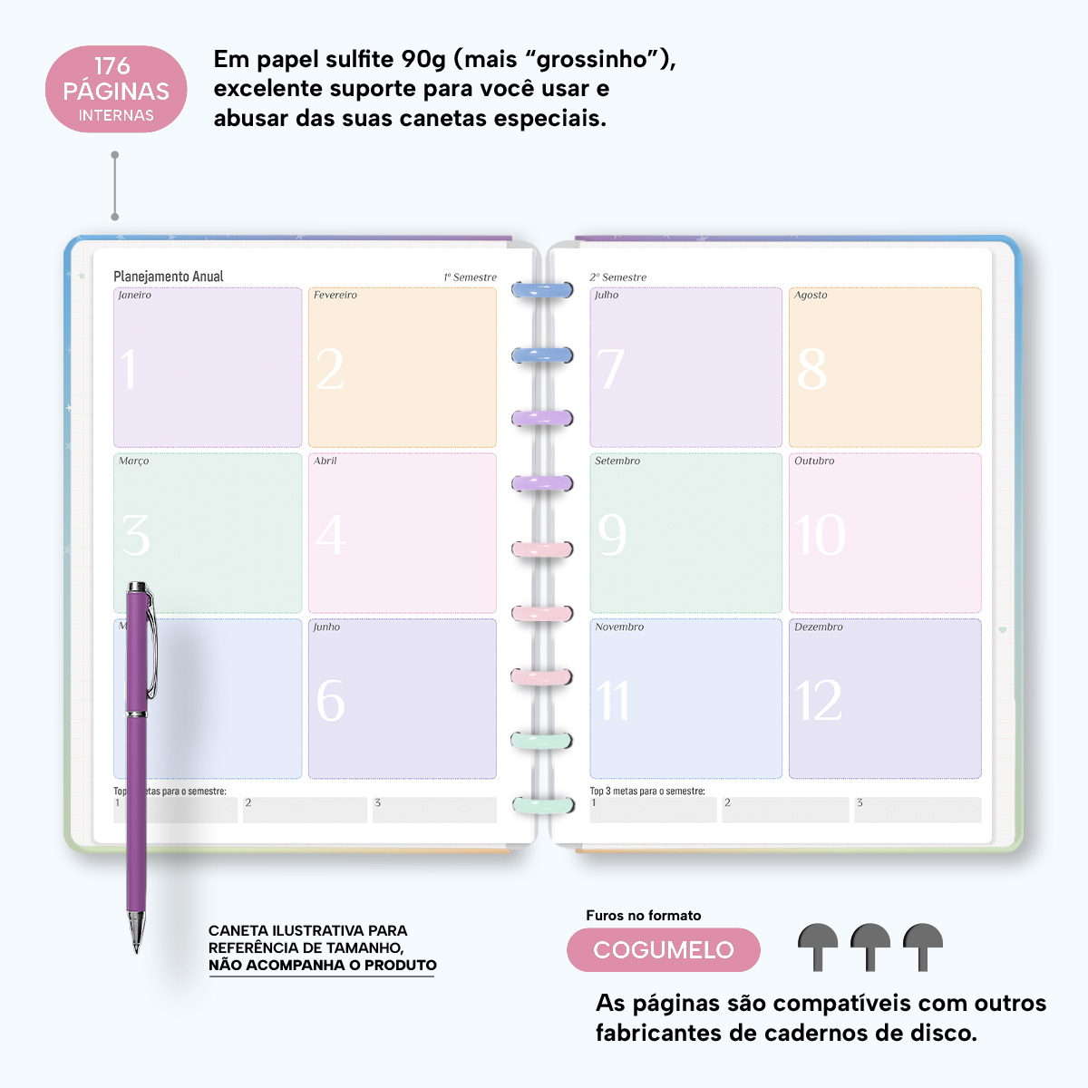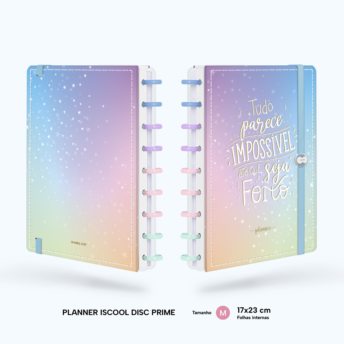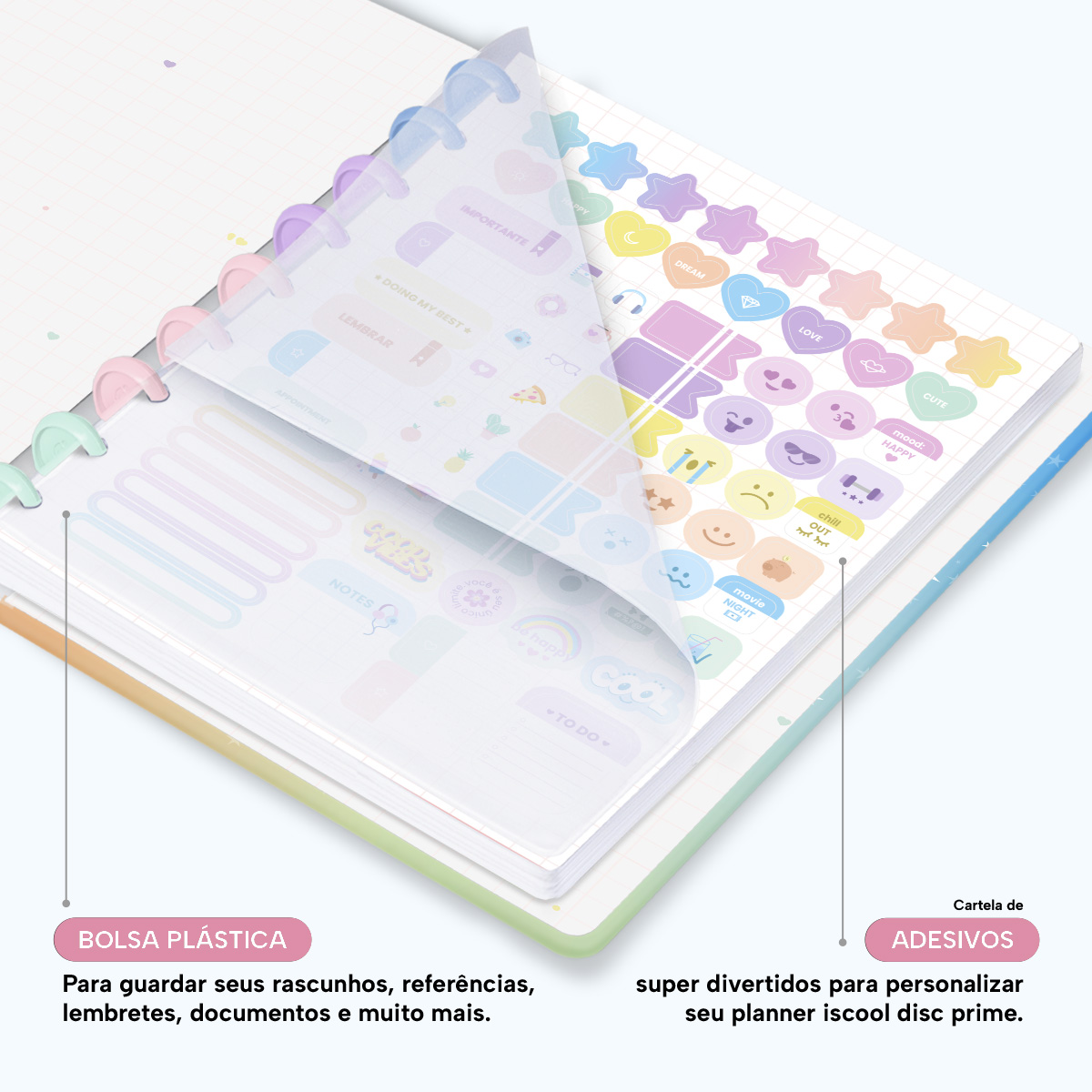 Além de tudo isso, o Iscool Disc Planner Datado 2026 conta com detalhes que fazem toda a diferença: elástico para fechamento da capa, proporcionando muito mais estilo e privacidade para suas anotações; e uma cartela de adesivos incríveis para que você possa personalizar o planner do seu jeitinho!