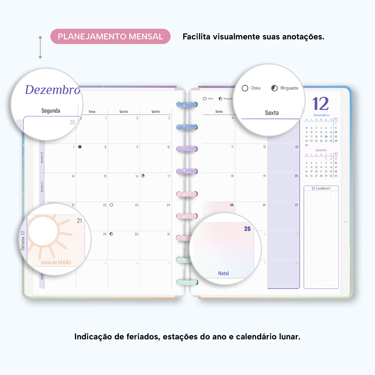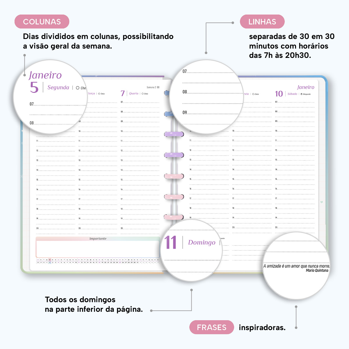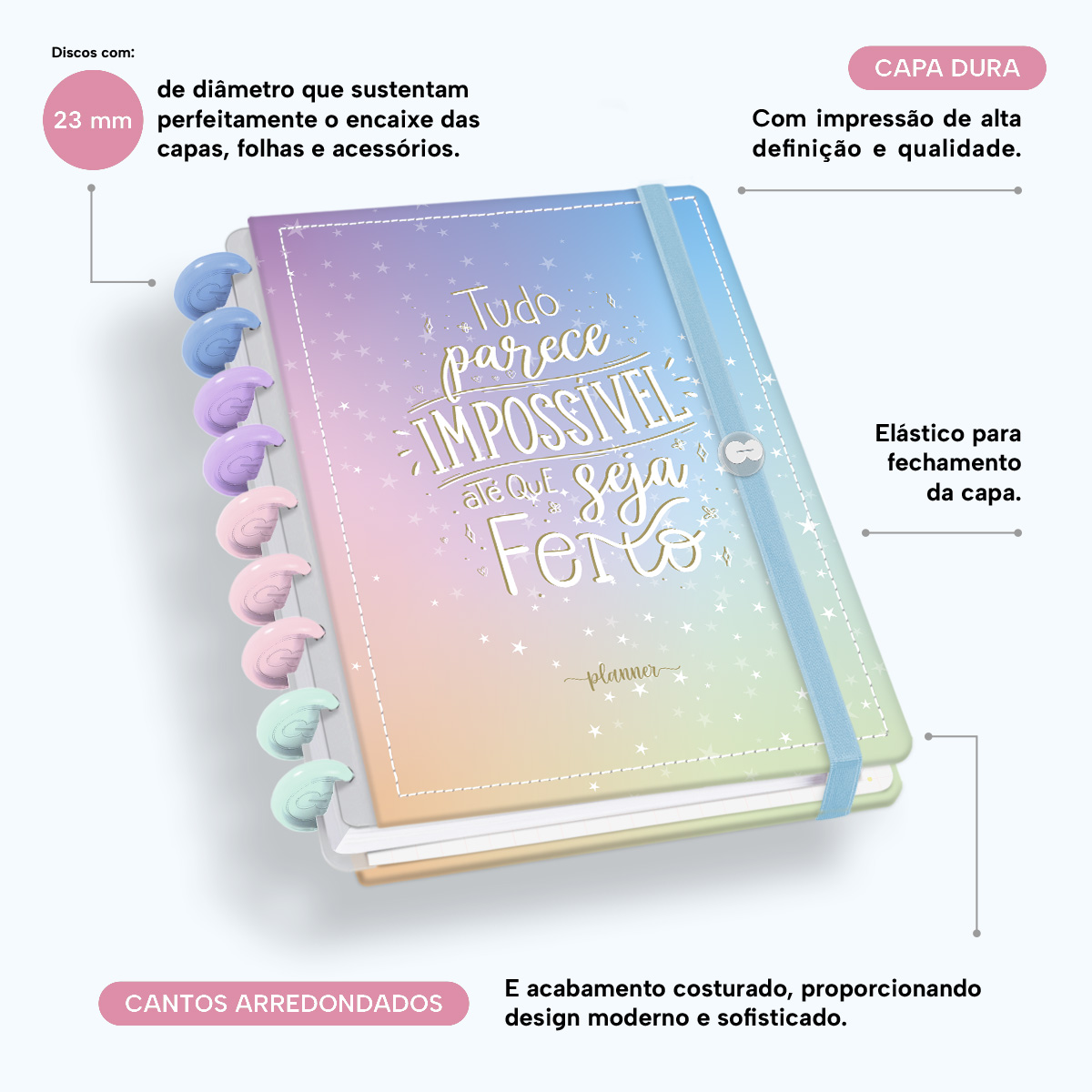 Além de tudo isso, o Iscool Disc Planner Datado 2026 conta com detalhes que fazem toda a diferença: elástico para fechamento da capa, proporcionando muito mais estilo e privacidade para suas anotações; e uma cartela de adesivos incríveis para que você possa personalizar o planner do seu jeitinho!