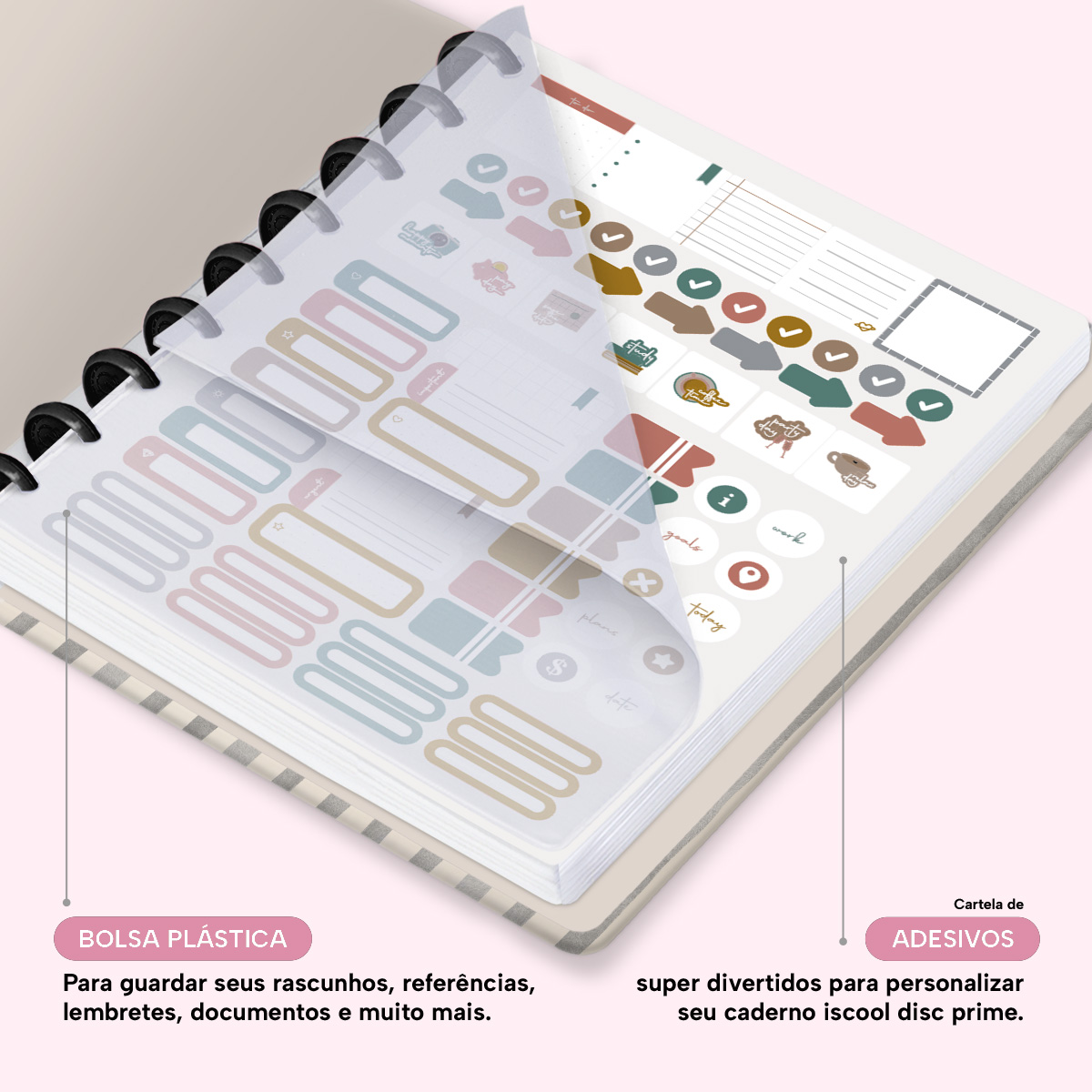 Além de tudo isso, o Iscool Disc Planner Datado 2026 conta com detalhes que fazem toda a diferença: elástico para fechamento da capa, proporcionando muito mais estilo e privacidade para suas anotações; e uma cartela de adesivos incríveis para que você possa personalizar o planner do seu jeitinho!