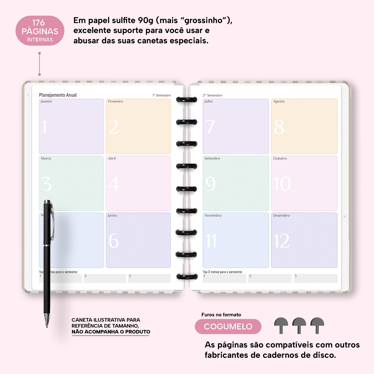 O miolo conta com páginas decoradas em papel sulfite 90g (aquele papel mais "grossinho"), para que você use e abuse das suas canetas especiais. Com furos no formato de "cogumelo", você poderá dar um "up" nele com nossos refis, além de ser compatível com outros fabricantes de cadernos e planners de discos.