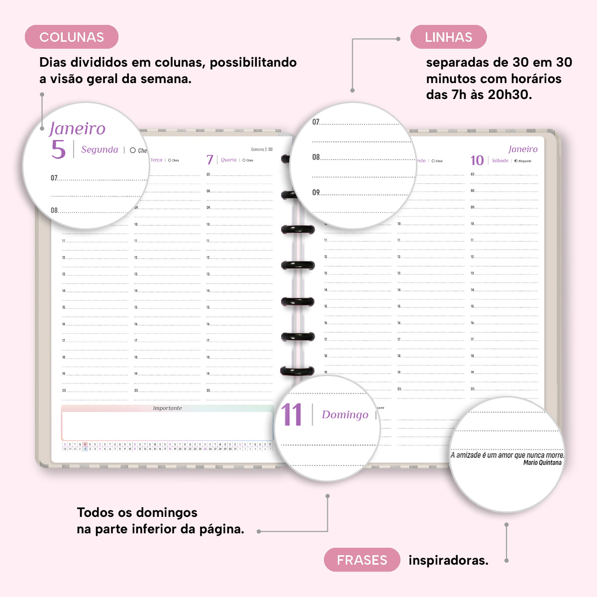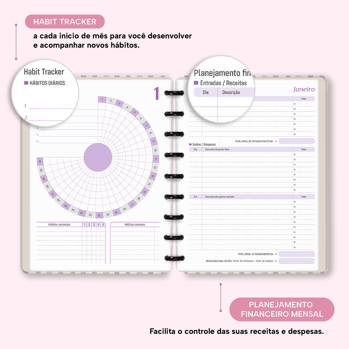 No início de cada mês, há um planejamento mensal, facilitando visualmente as suas principais anotações, um "Habit Tracker" para você desenvolver novos hábitos ou controlar os mais importantes, e ainda um planejamento financeiro, facilitando o controle das suas receitas e despesas, além de inúmeras outras funcionalidades.