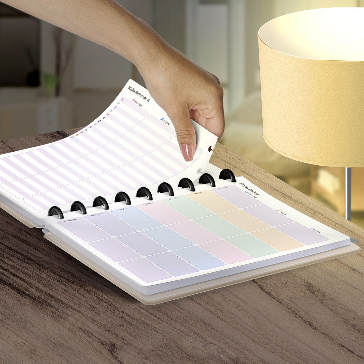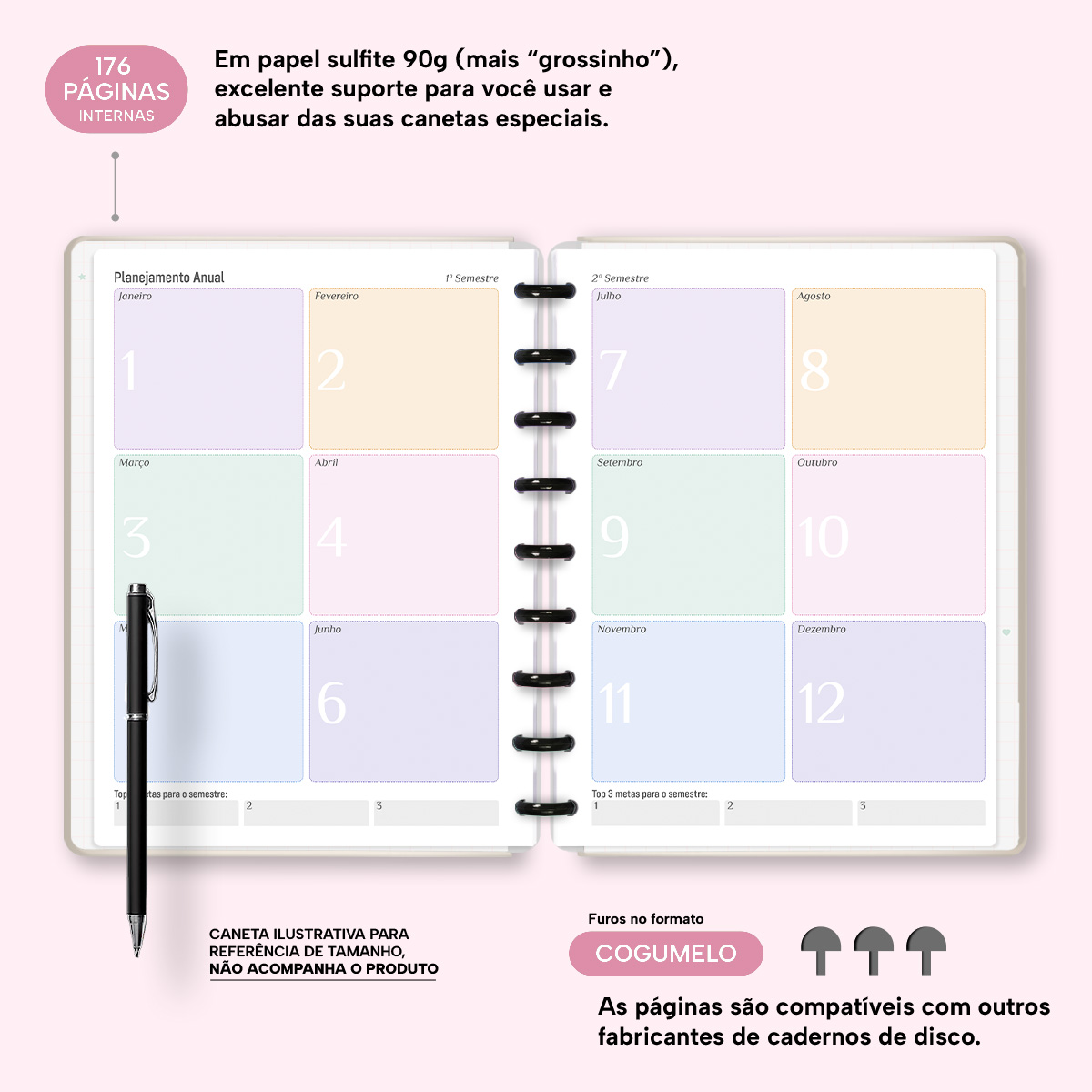 O miolo conta com páginas decoradas em papel sulfite 90g (aquele papel mais "grossinho"), para que você use e abuse das suas canetas especiais. Com furos no formato de "cogumelo", você poderá dar um "up" nele com nossos refis, além de ser compatível com outros fabricantes de cadernos e planners de discos.