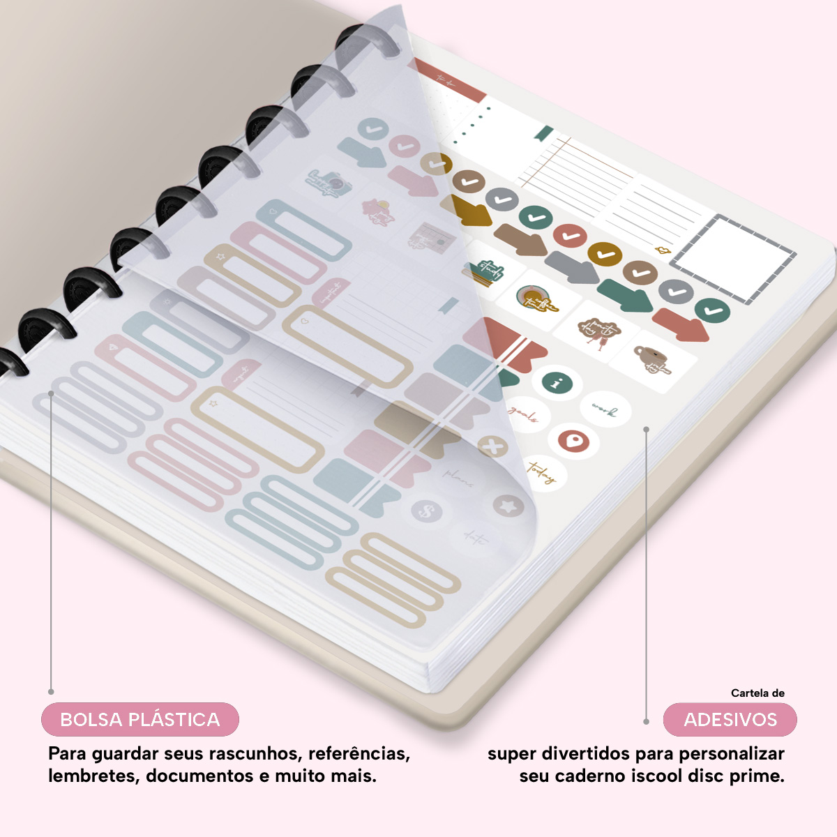 Além de tudo isso, o Iscool Disc Planner Datado 2026 conta com detalhes que fazem toda a diferença: elástico para fechamento da capa, proporcionando muito mais estilo e privacidade para suas anotações; e uma cartela de adesivos incríveis para que você possa personalizar o planner do seu jeitinho!
