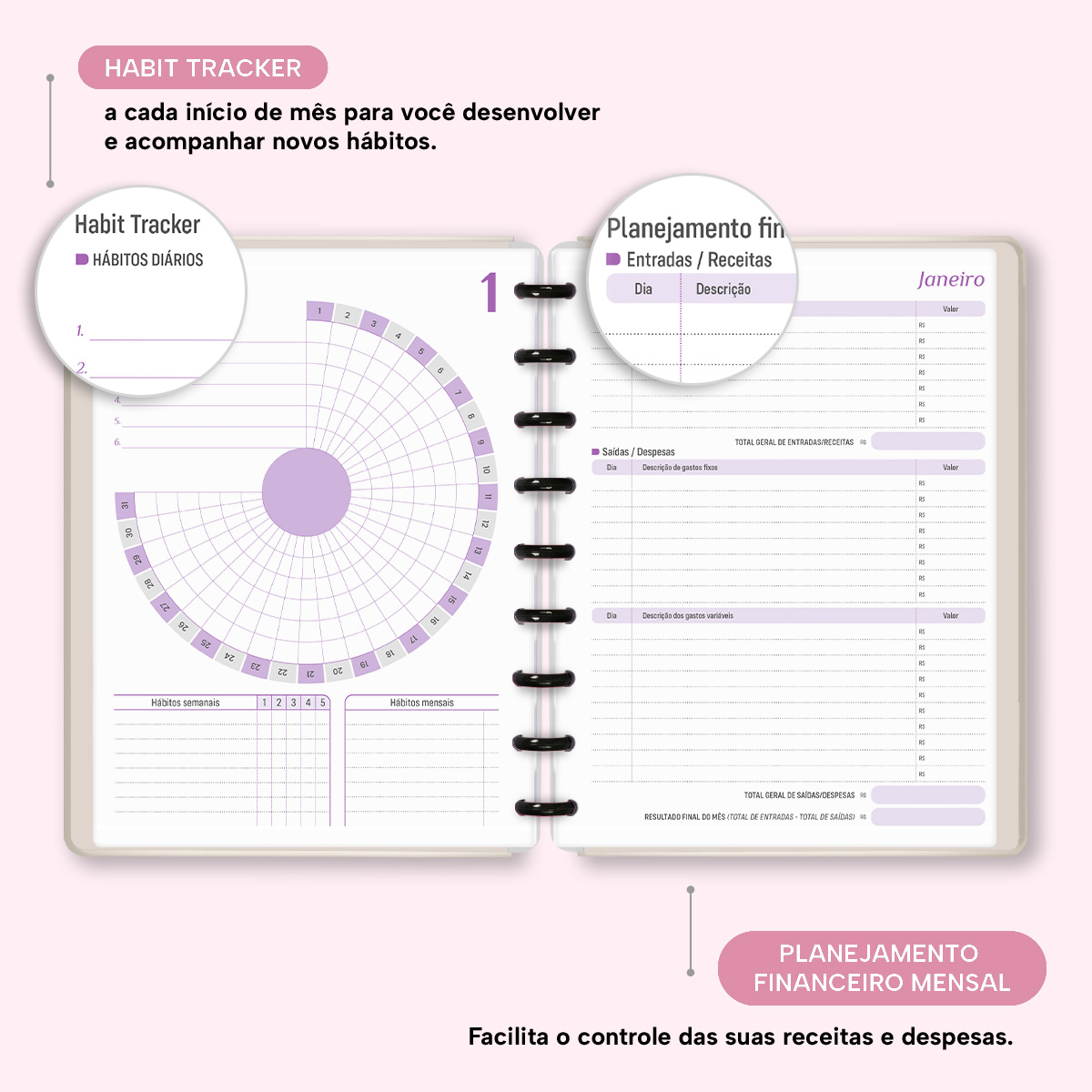 No início de cada mês, há um planejamento mensal, facilitando visualmente as suas principais anotações, um "Habit Tracker" para você desenvolver novos hábitos ou controlar os mais importantes, e ainda um planejamento financeiro, facilitando o controle das suas receitas e despesas, além de inúmeras outras funcionalidades.
