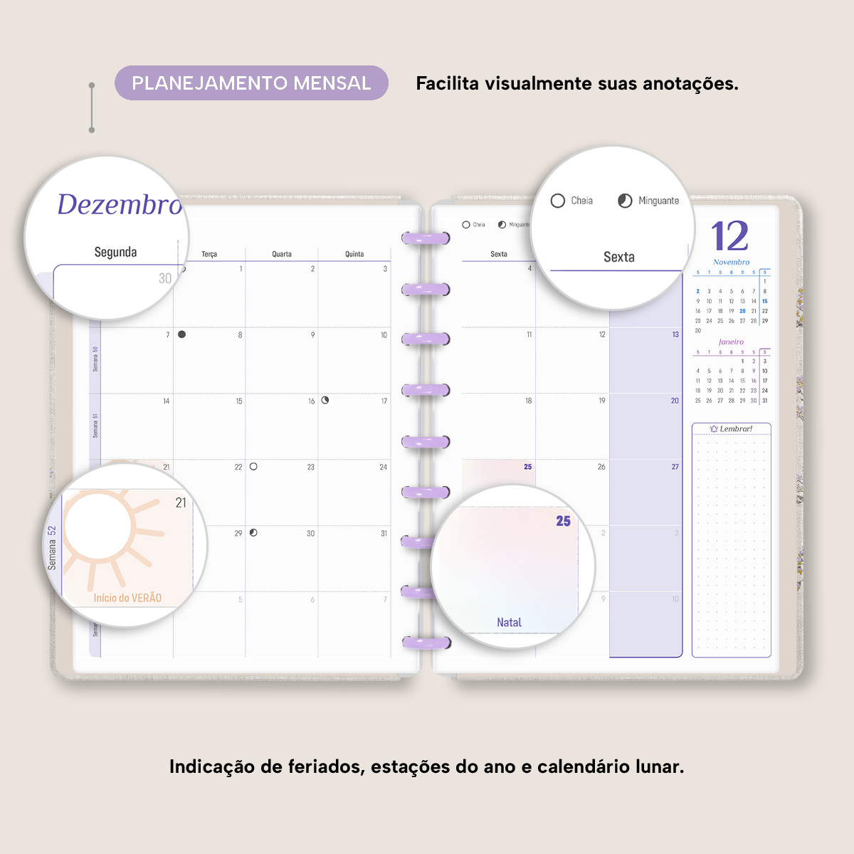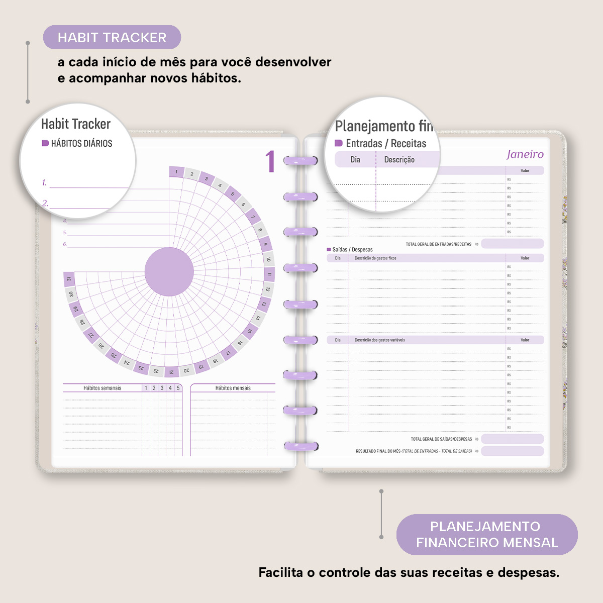 No início de cada mês, há um planejamento mensal, facilitando visualmente as suas principais anotações, um "Habit Tracker" para você desenvolver novos hábitos ou controlar os mais importantes, e ainda um planejamento financeiro, facilitando o controle das suas receitas e despesas, além de inúmeras outras funcionalidades.