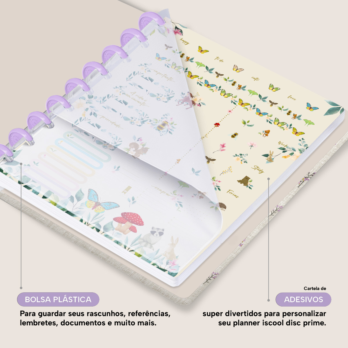 Além de tudo isso, o Iscool Disc Planner Datado 2026 conta com detalhes que fazem toda a diferença: elástico para fechamento da capa, proporcionando muito mais estilo e privacidade para suas anotações; e uma cartela de adesivos incríveis para que você possa personalizar o planner do seu jeitinho!